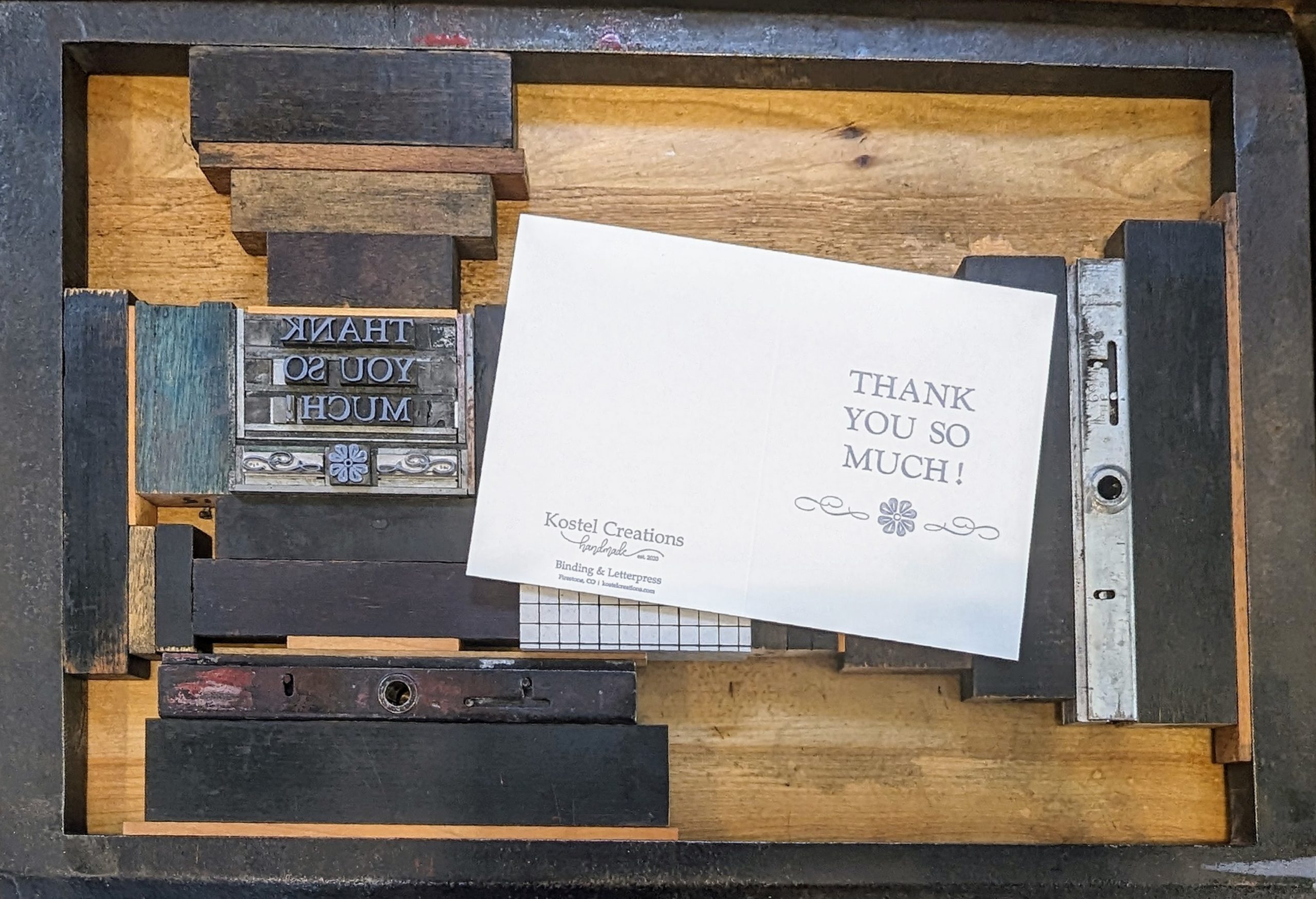 I started bookbinding in October of 2019 after having spent that summer to start the healing process (something I had not taken the time to do) from the loss of our son many years prior. I signed up for the binding class, hoping to learn something new and get back into creating. I went into the class with no idea that this would spark an interest in the bookbinding and letterpress arts. After learning this, I made my own gratitude journal with prompts I used for healing, as I had set out earlier in the summer. I continued working on my skills, signing up for other courses, watching YouTube videos, purchasing, and reading any binding book I could get my hands on. While researching bookbinding, I found letterpress and took a class on it, and instantly fell in love with the process, much like bookbinding. I knew between these two arts, I had found my thing. I would get asked to make gratitude or other journals for people, which brought me great joy. Thus, Kostel Creations was started. I enjoyed binding so much, but I still had my heart on letterpress. I wanted to start incorporating letterpress into my art and began the 2-year search for a press. I came across an ad from a family who wanted to donate their father’s letterpress collection. I reached out asking if they had anything to sell since they were local to me. I received a message weeks later and was asked to take a call to discuss. Nancy (Mr. Peterson’s daughter) and I connected and talked about her father and his businesses and life as a pressman. She then asked if I would like to see the press setup. I politely said I would love to, but I needed to know what they were thinking about prices, as I did not want to waste their time if it was not affordable for me. I remember her kind words to this day: “Oh, no, we don’t want anything for it; we just want to see our father’s press getting used and kept alive.” Tears welled up in my eyes, much like every time I tell the story. I have been creating ever since and have enjoyed the process dearly. In the process, I have found healing in my incredible journey. There is so much to learn in running a side business and in binding and letterpress, and I have much more to go. It will be well worth my efforts if I can help just one person find healing, joy, and love as I did, whether it be in a new journal or in learning the processes (I love to teach what I have learned)