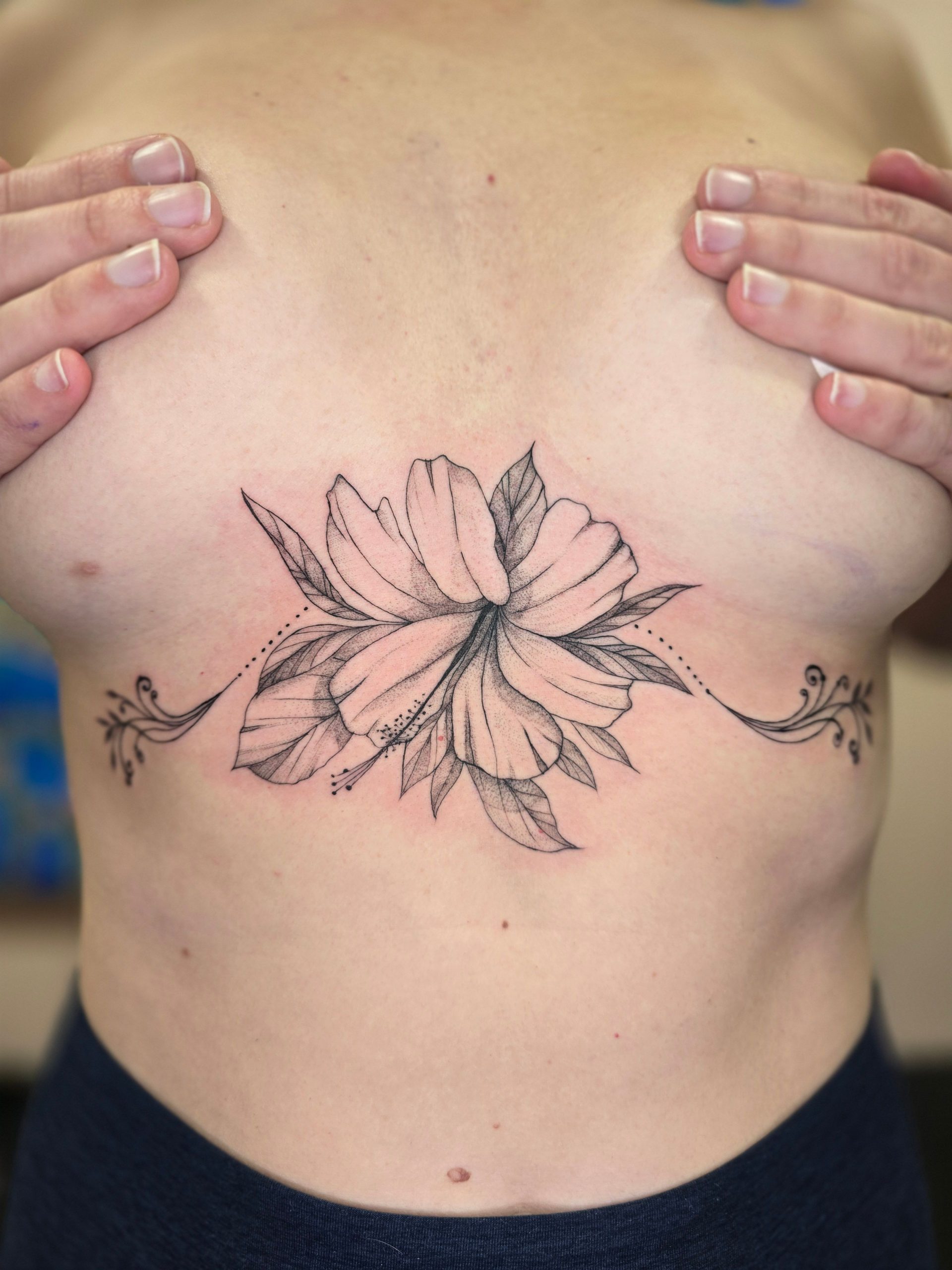 I am a fineline tattooer known for floral compositions, all things femme, sentimental, cute, and delicate. I am here for the girlies. There are tattooers who turn their nose up at tattooing someone’s kid’s name or tattooing birth flowers. This is not me. I will tattoo your kid’s name across your chest if you ask me to.