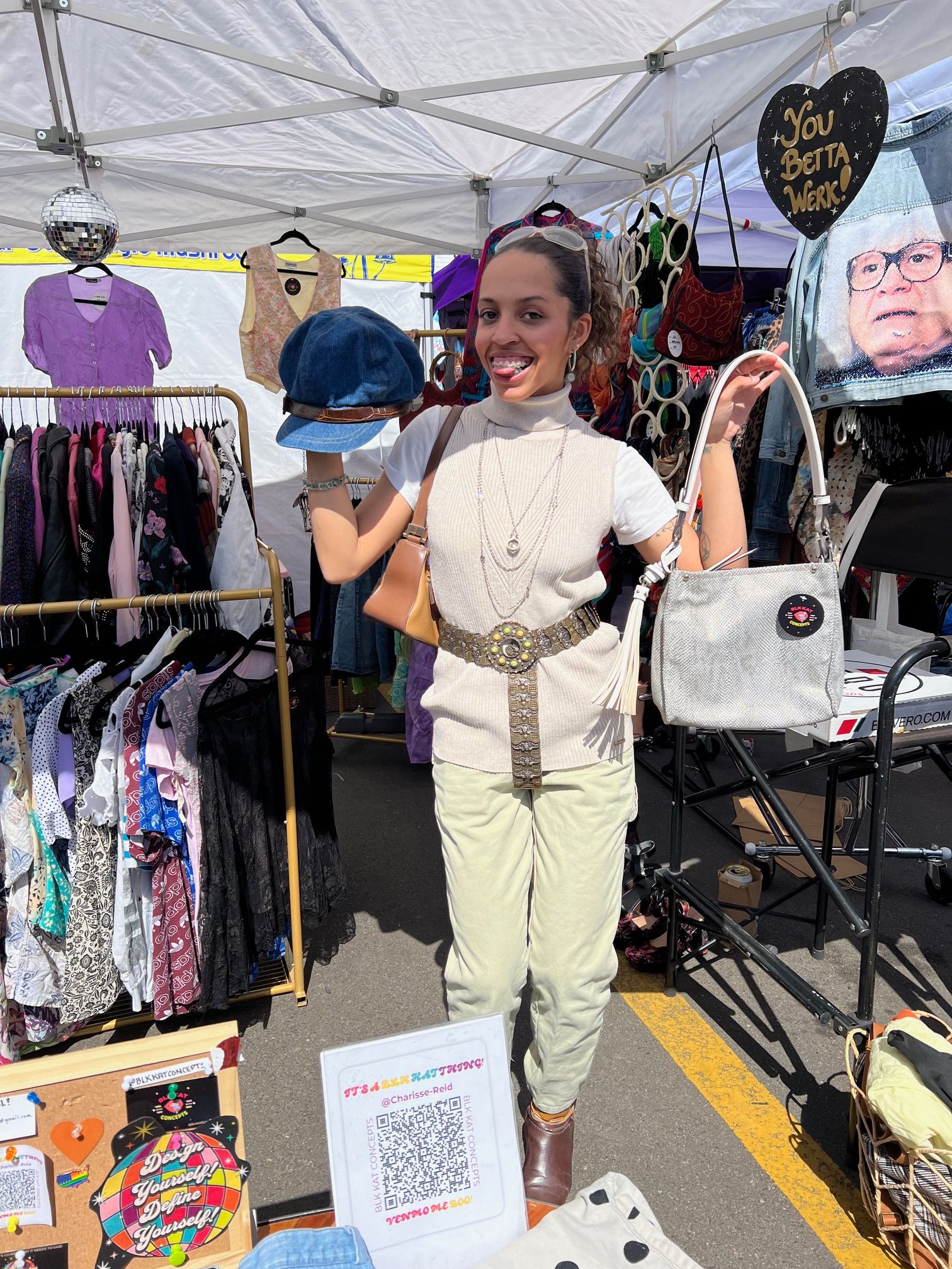 It all began on an early morning in July…LOL! Just think of me as your fashion forward, super supportive, Jersey girl bestie. I am an Interior Designer with a Bachelor of Science degree in Interior Architecture from Thomas Jefferson University in Philadelphia, PA. I enjoyed my summer and decided to take a shot in the dark and apply for jobs worldwide. I got feedback from Denver, had a wonderful offer and hit the ground running. I moved to Denver in October of 2022 and have been here ever since! My first year here was rough and I went through some hardships that pushed me into a pretty dark place. I was away from my friends, family, and was forced to move into my own place with short notice after a jarring breakup. The chaos of this wild transition gave me the confidence to stop waiting for people, make moves, and be the most badass version of myself I could be. I have always loved vintage fashion and would tend to receive compliments on my outfits. With Denver’s fashion scene on the rise, many people encouraged me to start a side hustle for vintage fashion and style curation. I met Patrick Sanders from Salt & Pepper Apparels and he opened the doors to the market life for me. I have nothing but love for him and his partner Sam, as they gave me the platform to make my dreams a reality. Shoutout to Lexi as well from Old School Cool, they are truly a gem! After some brainstorming and some reasonable sourcing, BLKKAT CONCEPTS was born. I did markets for about a year and some change and have hopes to pop back into the scene again sometime in the future. During the down season, I decided to pick back up on my social media series TREAT YOURSELF TUESDAY, which I started in college to give myself a day out of the week to go on a solo adventure around the city. I eventually started posting to my social media more frequently and got the attention of multiple businesses around Denver. I have to send a huge thank you to Blind Tiger Lounge who believed in my vision and was nice enough to work with me for my very first social media collaboration! The series has gained some traction and I am proud to say that I am continuing to build my social media presence. My main mission now is to encourage and inspire others to give back to themselves, wear funky vintage fits (or whatever makes them happy), and live life to the fullest!