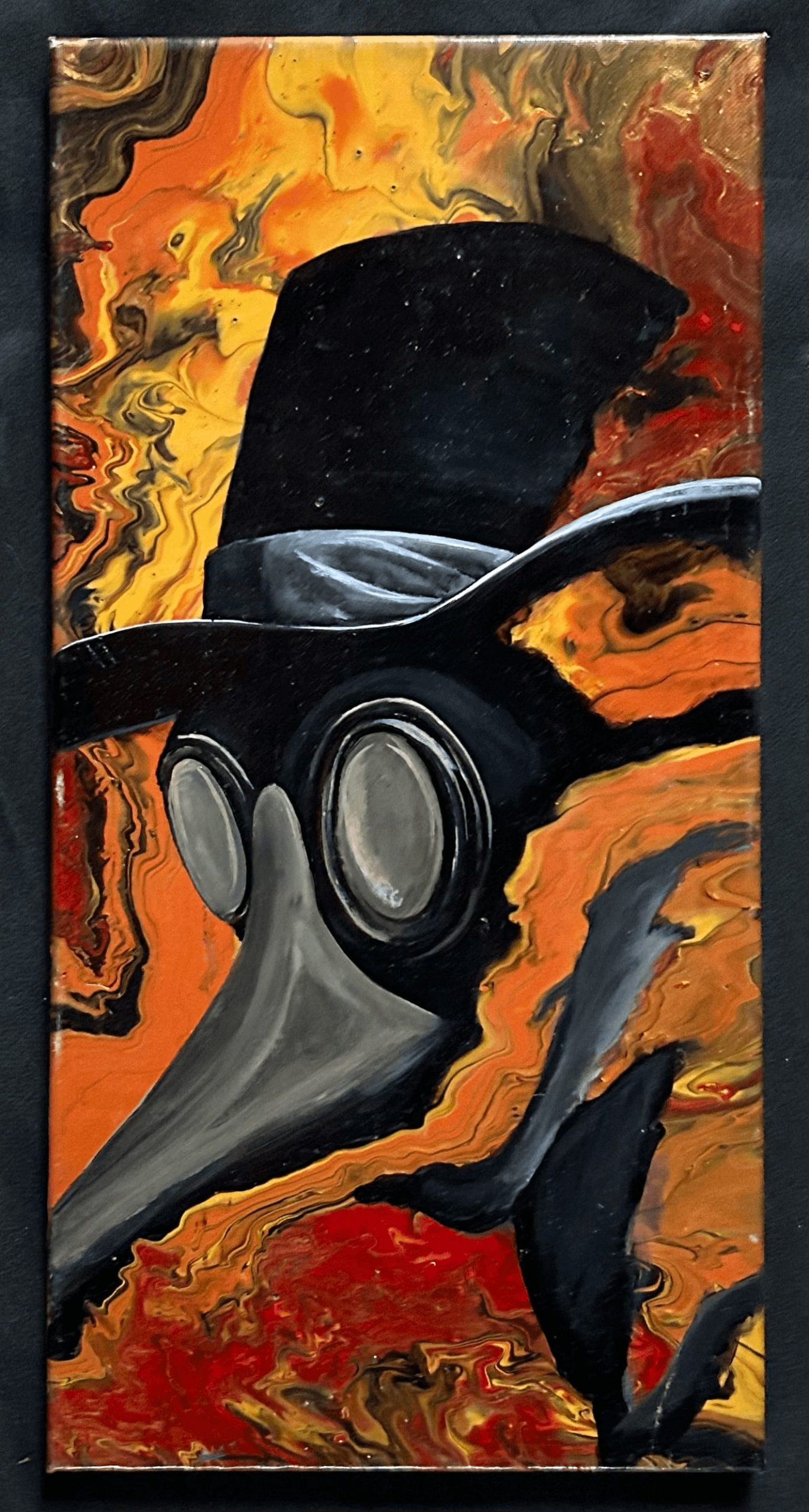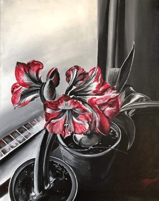 I was recently asked at an event, “Do you just go into your mad lab and create?” Well, yes, that sums it up! Over the last few years, my work has branched to new mediums, and sometimes, combining them has made it more unique. It all started with acrylic pet portraits and two of my first original paintings, “The Dock” and “The Amaryllis,” where I focused on the contrast of black and white with a small amount of color in each piece. Shortly after pursuing art as a full-time job, COVID hit, and I started working from home. I was still interacting with my clients at the halfway house but without the much-needed outlet to decompress mentally with my coworkers. During this time, my original paintings got dark, and at first, I was hesitant to showcase them at an event. I eventually did, and I received so many compliments and great feedback, and they were selling. People appreciated these pieces because they could interpret through my work how I felt and relate to what I was feeling. These “dark” pieces took a lot of courage to display but allowed me to stand out at an event and relate more with my audience.