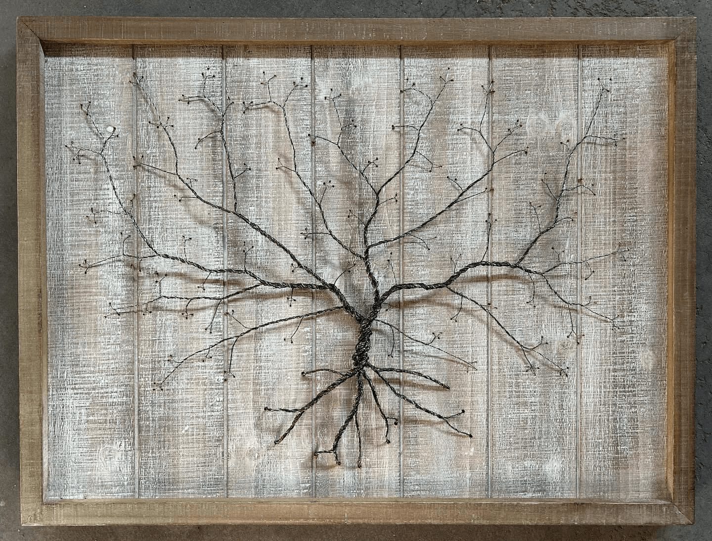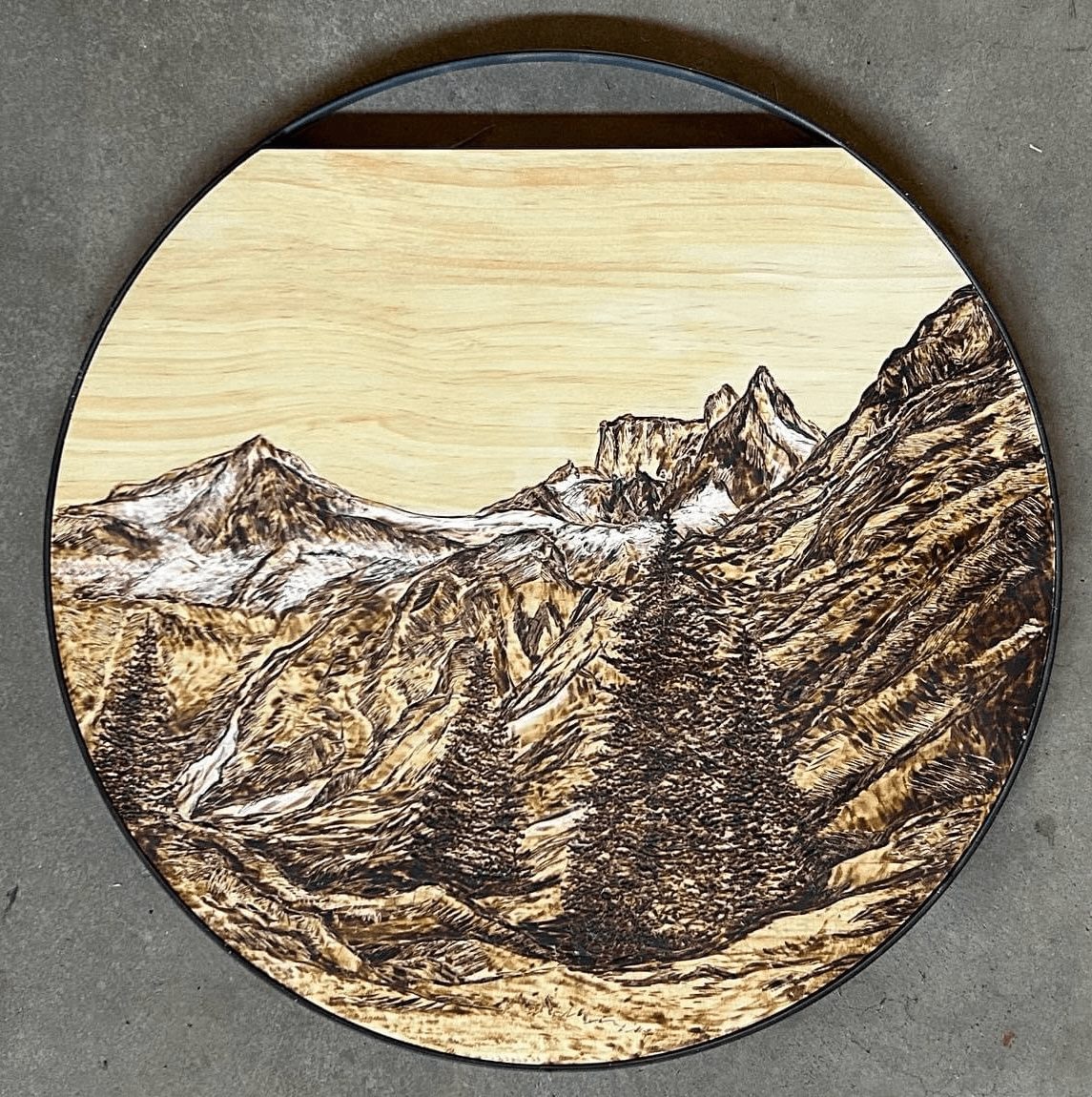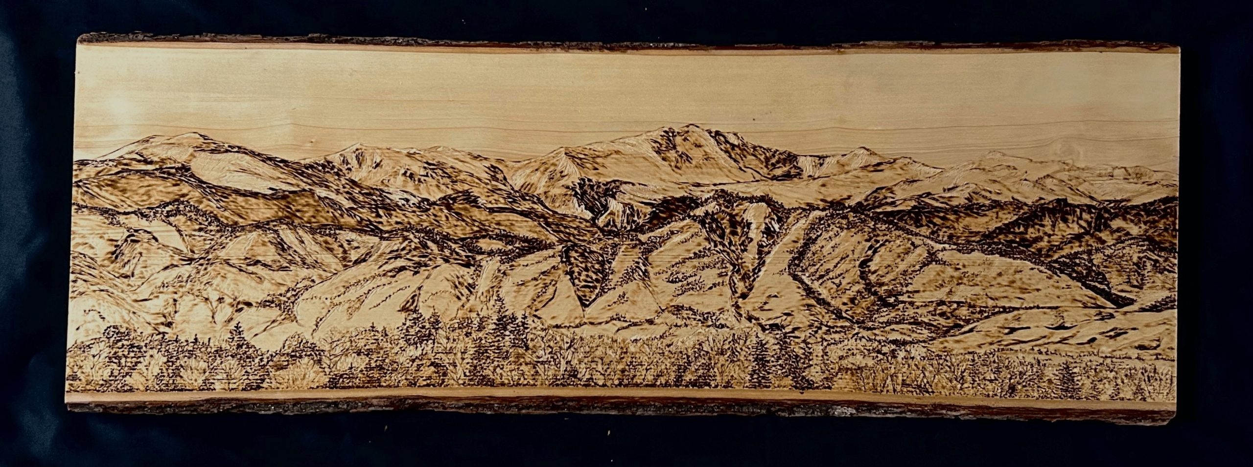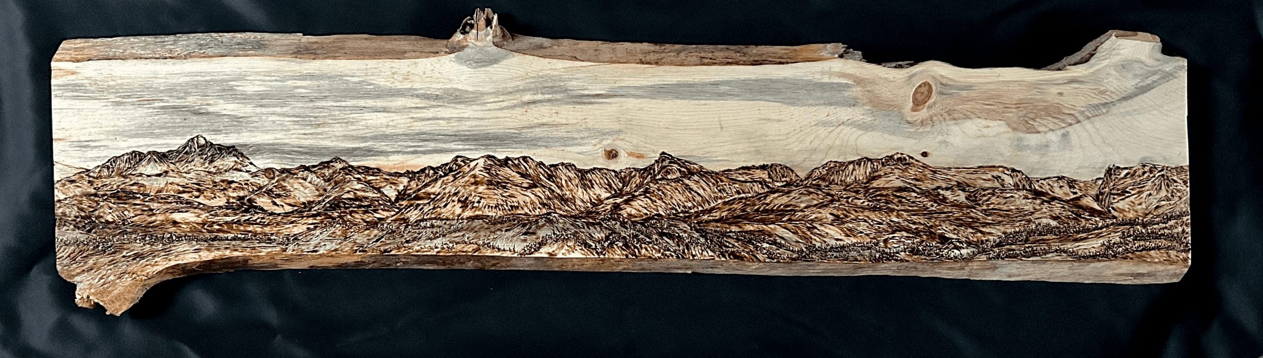 Next came the wood carving and burning; after being asked by a coworker to make an address plaque for her home, I started experimenting with wood carving and burning. My earlier pieces were very simple, but I began to grasp the technique over time and have created several pieces, from mountain scenes to dog-related plaques and leash holders. Then came the copper wire and wire-wrapped jewelry. I was terrible at it at first, but after a few YouTube videos and some books on wire wrapping, I had a decent idea of what I was doing. Learning a new art was fun at first, but then I got frustrated with the tedious process. I didn’t want to follow the rules anymore, but I had a ridiculous amount of wire left over. So, I started making spirals from the scraps and adding them to small acrylic tree paintings. I later decided to try to create just a wire tree on wood, and they soon became as popular as my wood art. I thoroughly enjoy all the work that I do, and I am most proud of my new wood-carved and burned landscapes. Being located so close to the Rocky Mountains has helped with the subject of my work and the demographic of people who have made these pieces so popular. Despite the popularity of the landscapes, I will still continue to do what sets me apart from others: create unique pieces of art with whatever medium I can get my hands on.