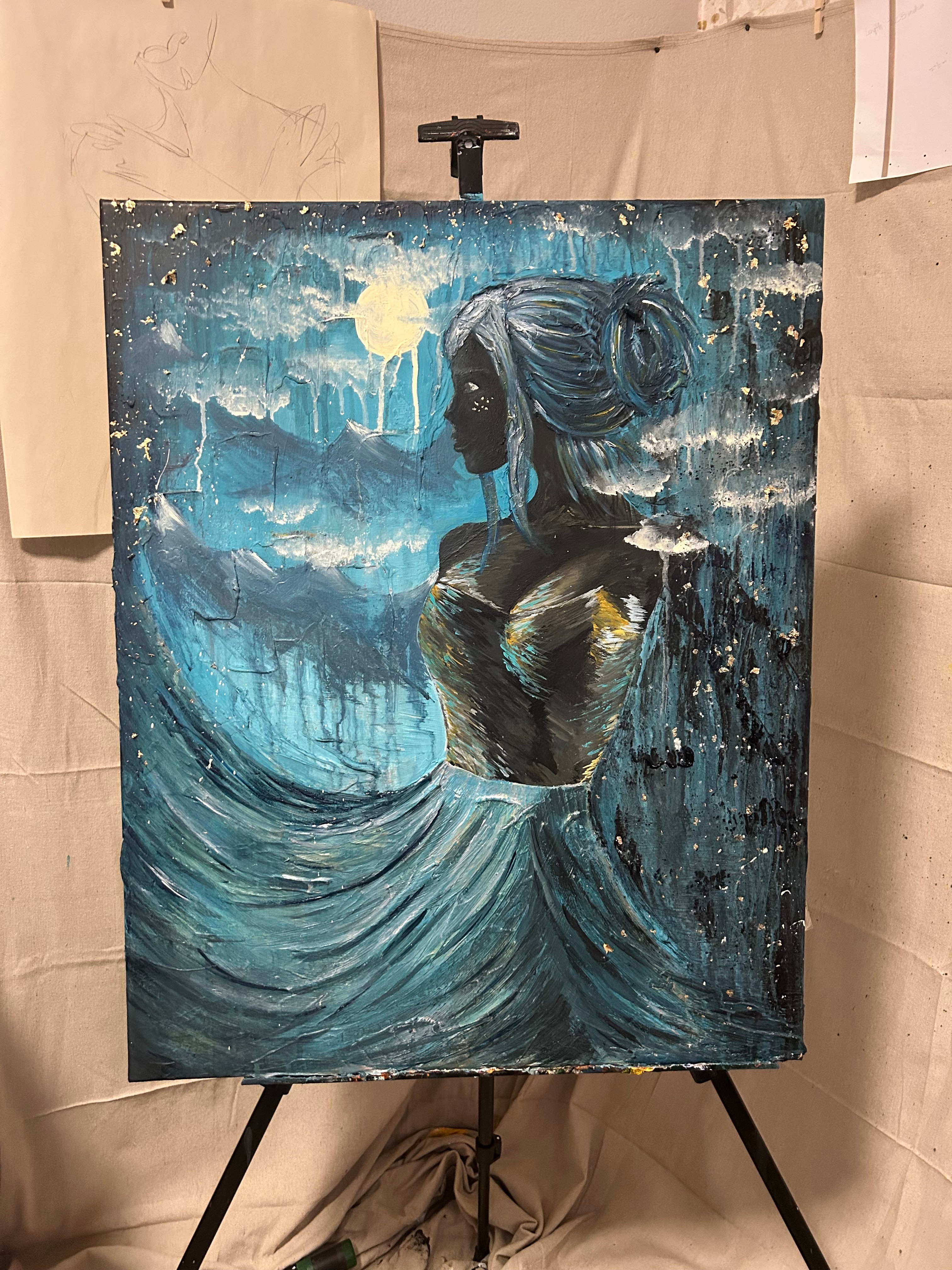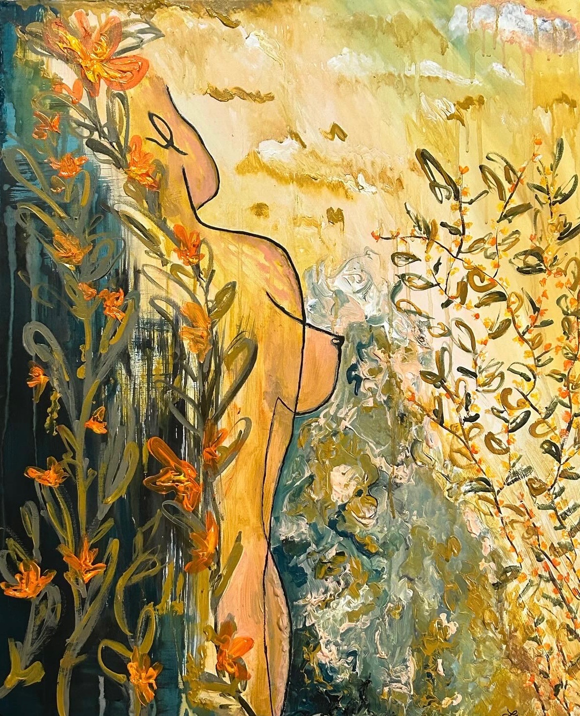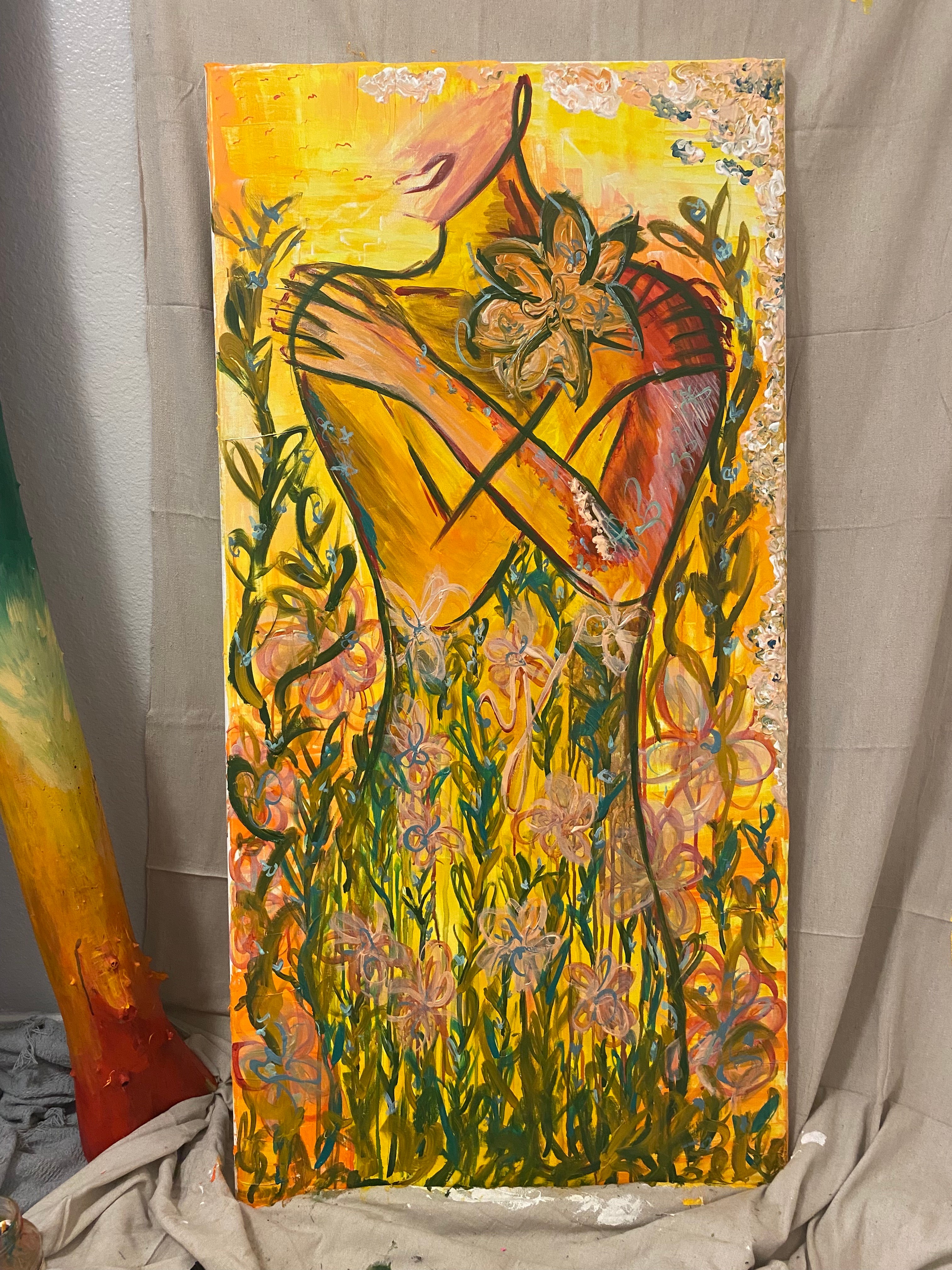 Right now, I’m focused on a body of work that feels incredibly close to my heart—paintings of divine feminine figures surrounded by nature elements. Each piece is an act of reclamation. Through color, texture, and form, I explore what it means to come home to the feminine—her sensuality, her power, her softness, and her wildness. It’s about healing that creative and sensual energy so many of us have been disconnected from, especially those of us who have experienced trauma.