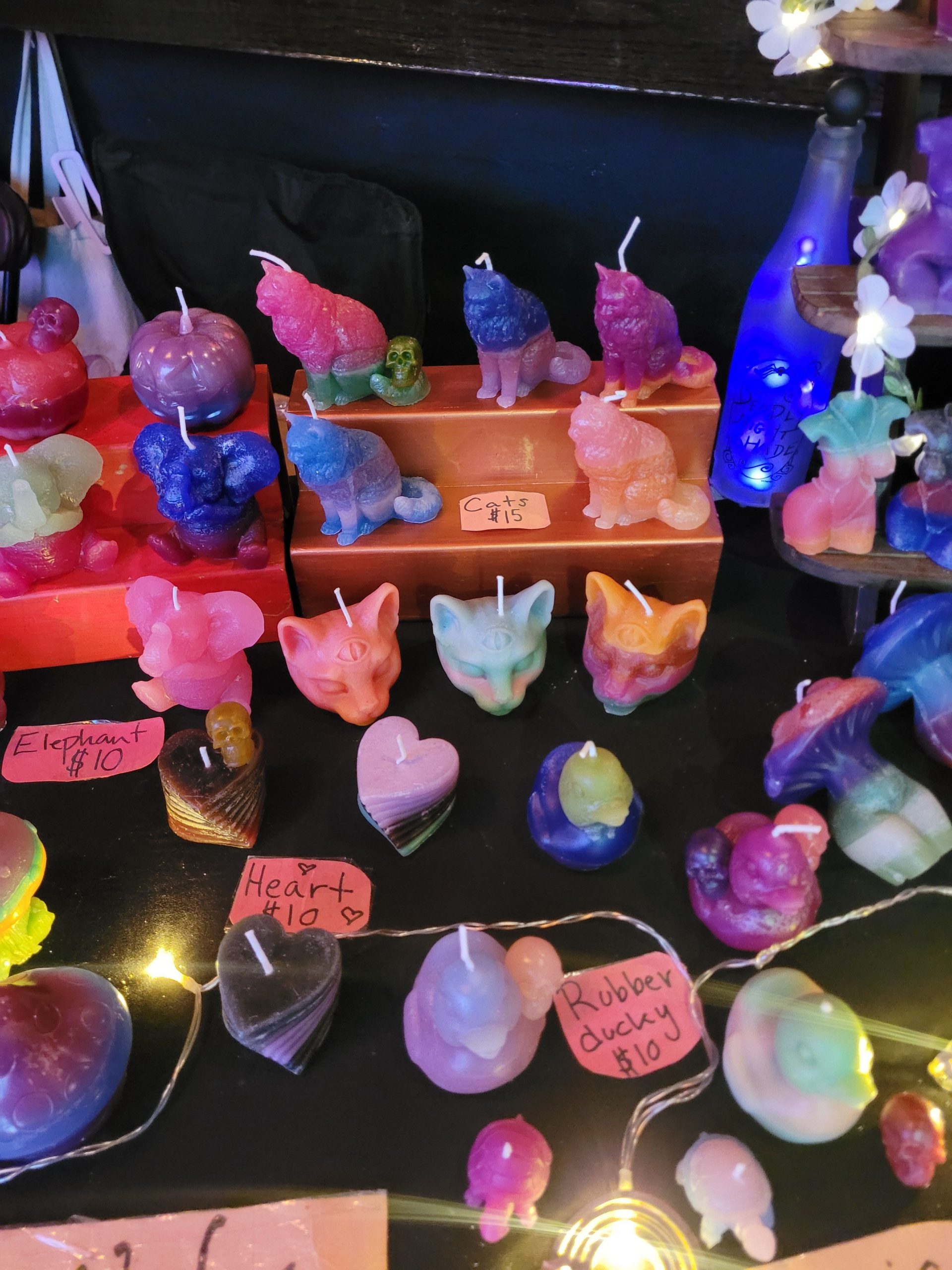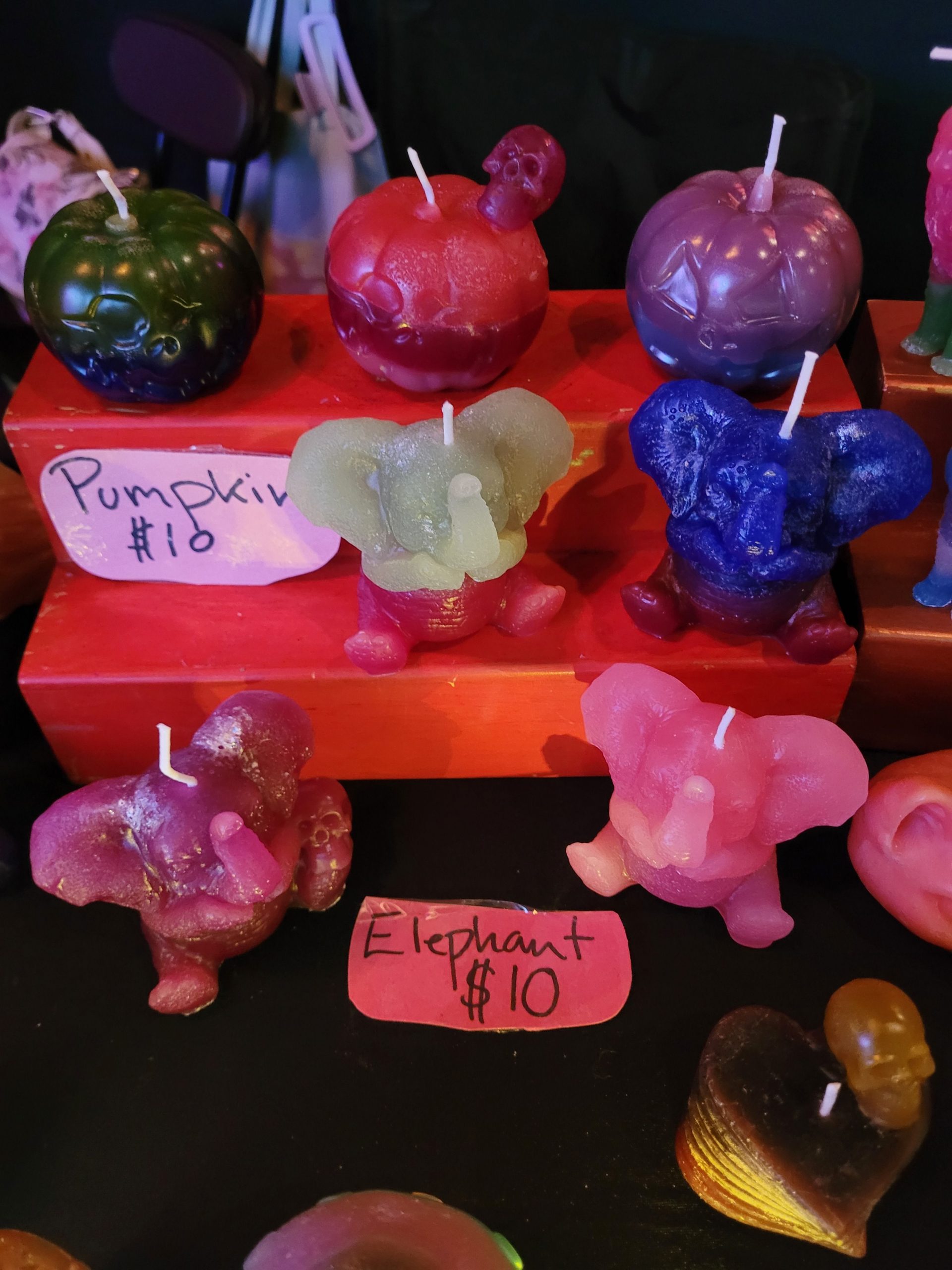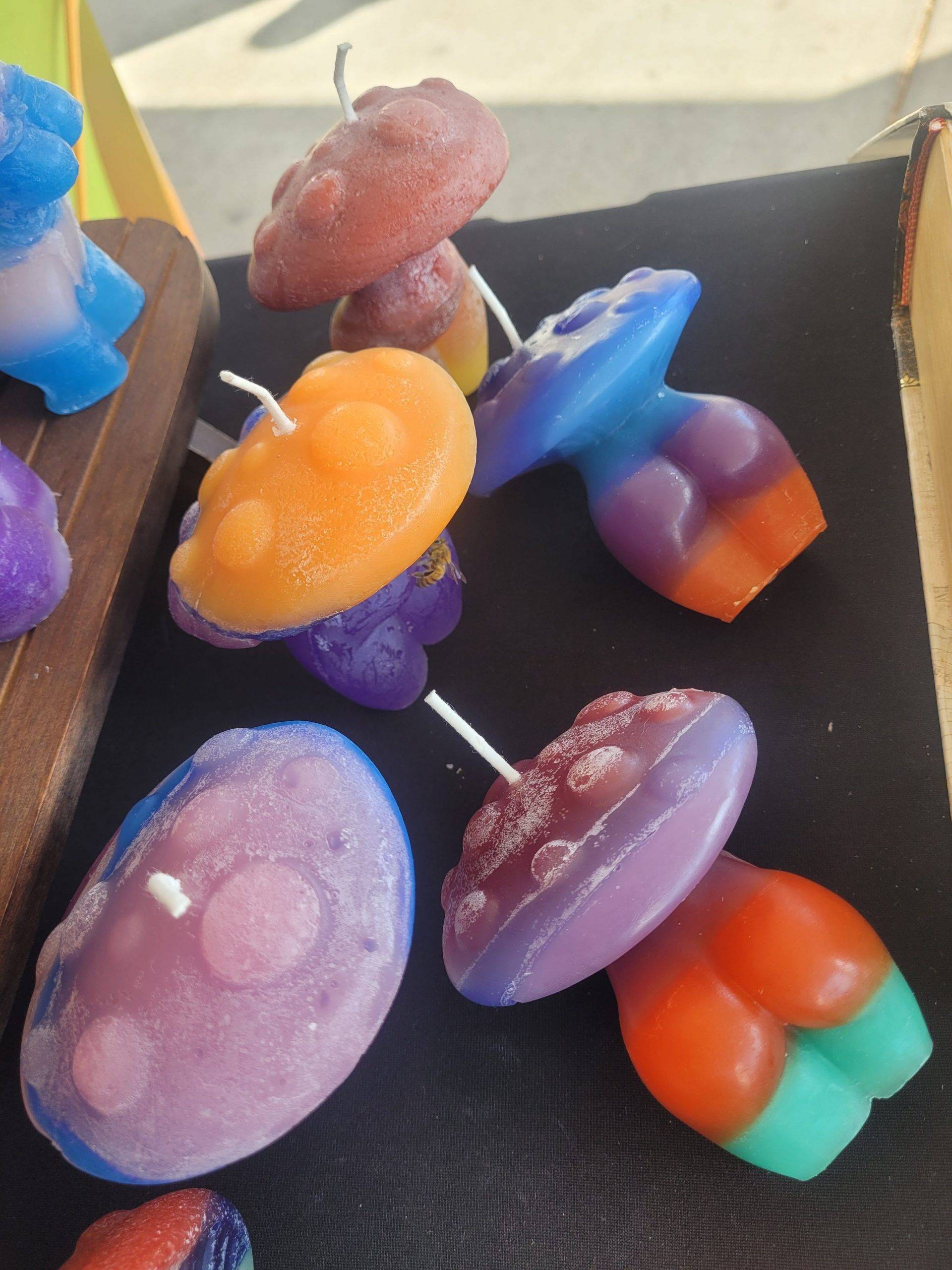 I make them in all kinds of shapes ranging from naked ladies to elephants and skulls. I think there’s a little something for everyone, and most people find on they want to take home when they see my setup. I think something that sets me aside are my color choices. I like to experiment with lots of fun layers and colors and that makes them all the more unique.