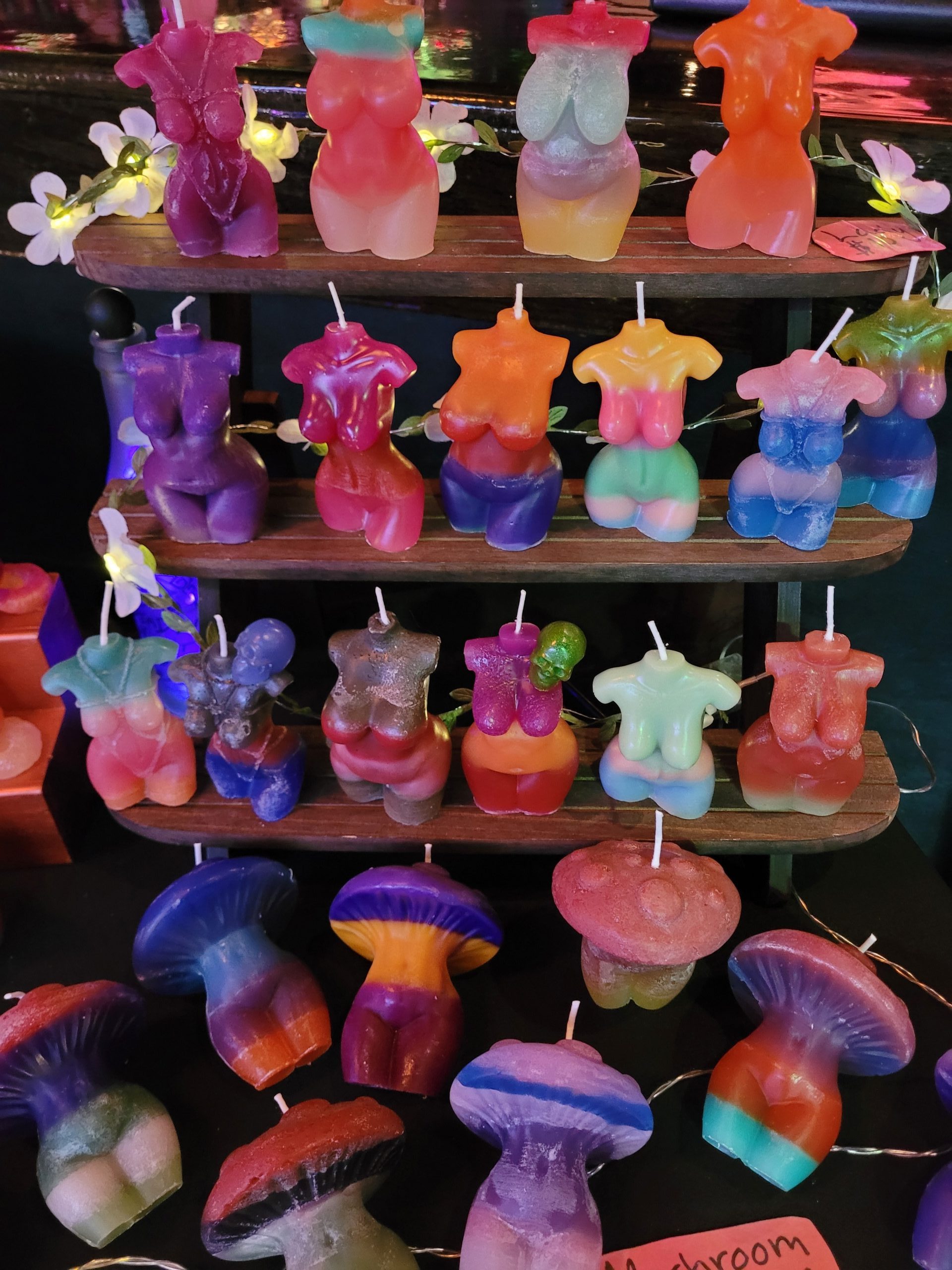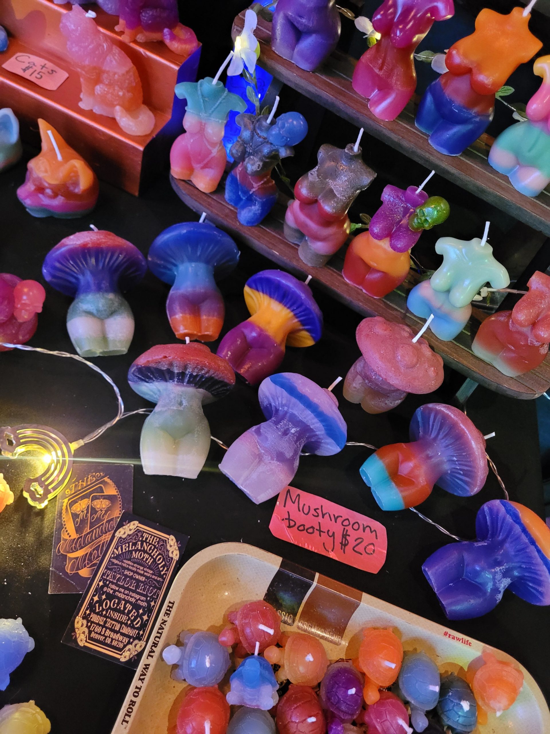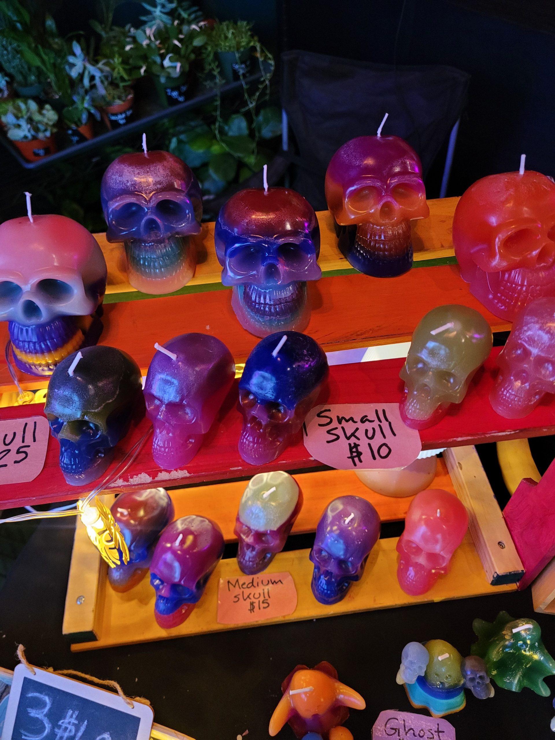 I make them in all kinds of shapes ranging from naked ladies to elephants and skulls. I think there’s a little something for everyone, and most people find on they want to take home when they see my setup. I think something that sets me aside are my color choices. I like to experiment with lots of fun layers and colors and that makes them all the more unique.