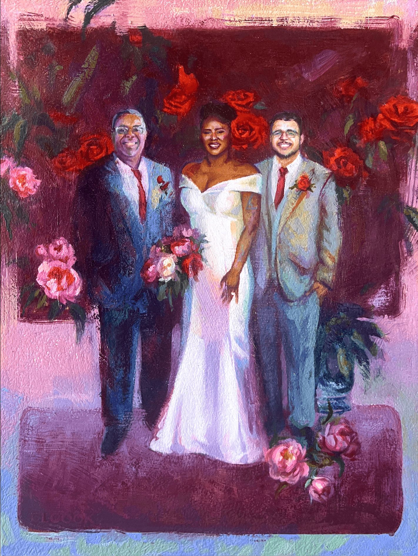 One commission early on made me realize just how powerful this work could be. A bride asked me to create a wedding painting as a gift for her fiancé. His father had passed away just weeks before their wedding, and she wanted him included in the artwork. Using reference photos, I painted the three of them together, a tribute to love and loss. When the groom saw the painting, it was an incredibly emotional moment. I could see how much it meant to him, becoming one of his most treasured possessions.