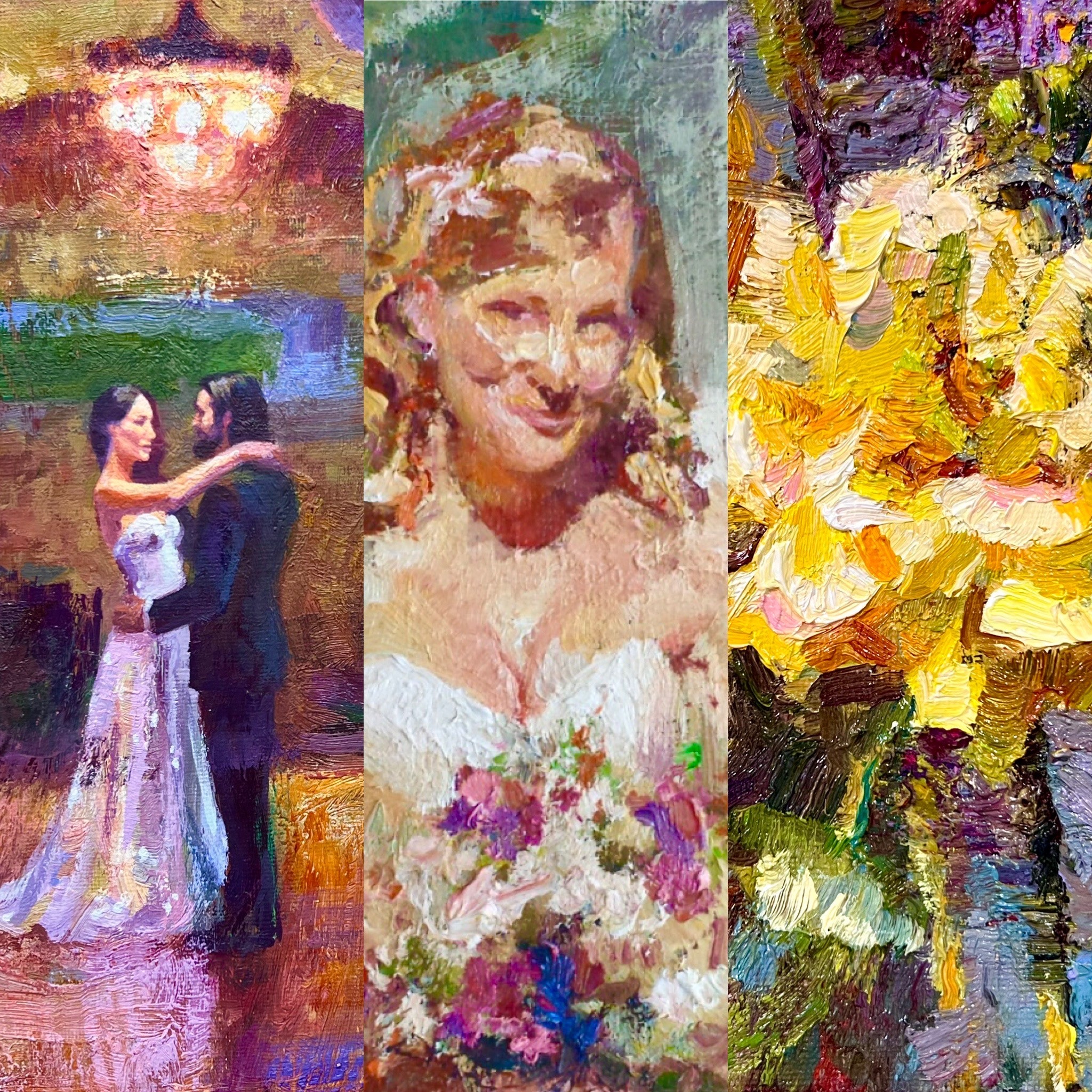 I’ve brought every part of myself into this work. Each painting is infused with the energy of the day, capturing not just how it looked but how it felt. Back in my studio, I refine these works with care, selecting professional-quality oil paints and hand-gessoing archival wood panels to ensure my paintings would last for generations. These details are more than technical choices; they are my way of honoring the significance of each couple’s story.