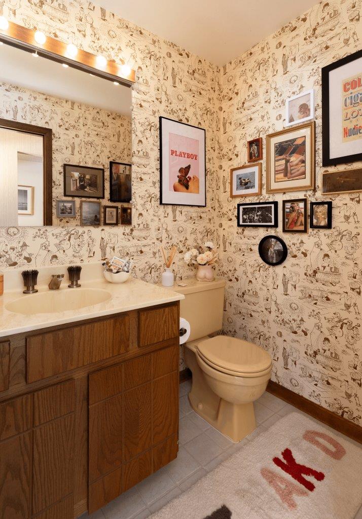 Our studio is certainly distinct as it has a lot of true to the era finishes, from the carpet to the untouched kitchen and bar to our bathroom with wallpaper from the original build date. We have modern and updated furniture (as well as a fully functional disco ball) that bring the space into the 21st century.