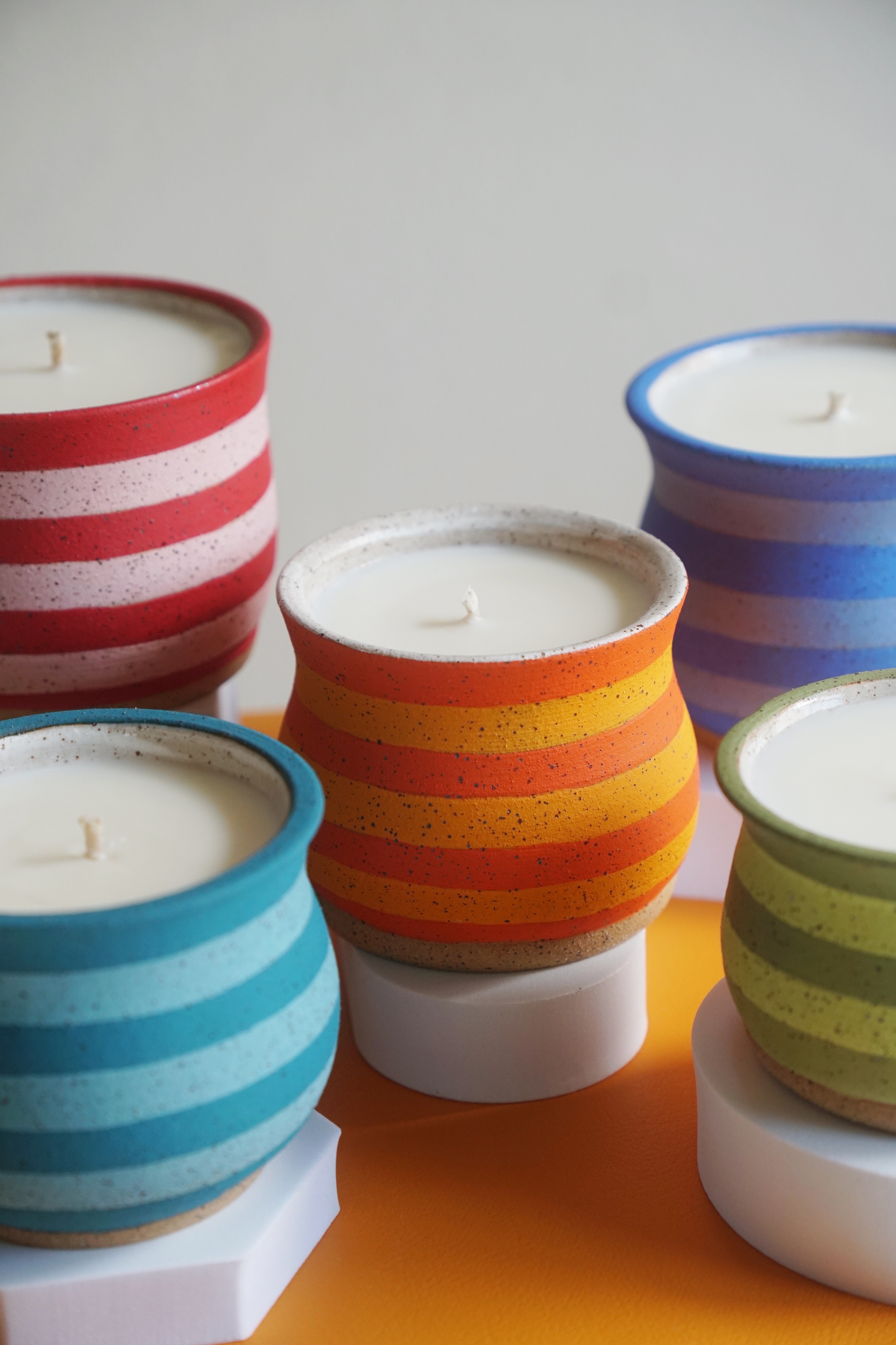 By combining the raw elements of clay with vibrant hues of color, two opposite styles are being blended. The textured clay connects with the Earth tones of minimalist design while the bright color pallets spark joy for the lovers of maximalist style. I’d like my pieces to make people from both ends of this design spectrum to think “maybe this bright orange candle IS just the thing I need for my space”.