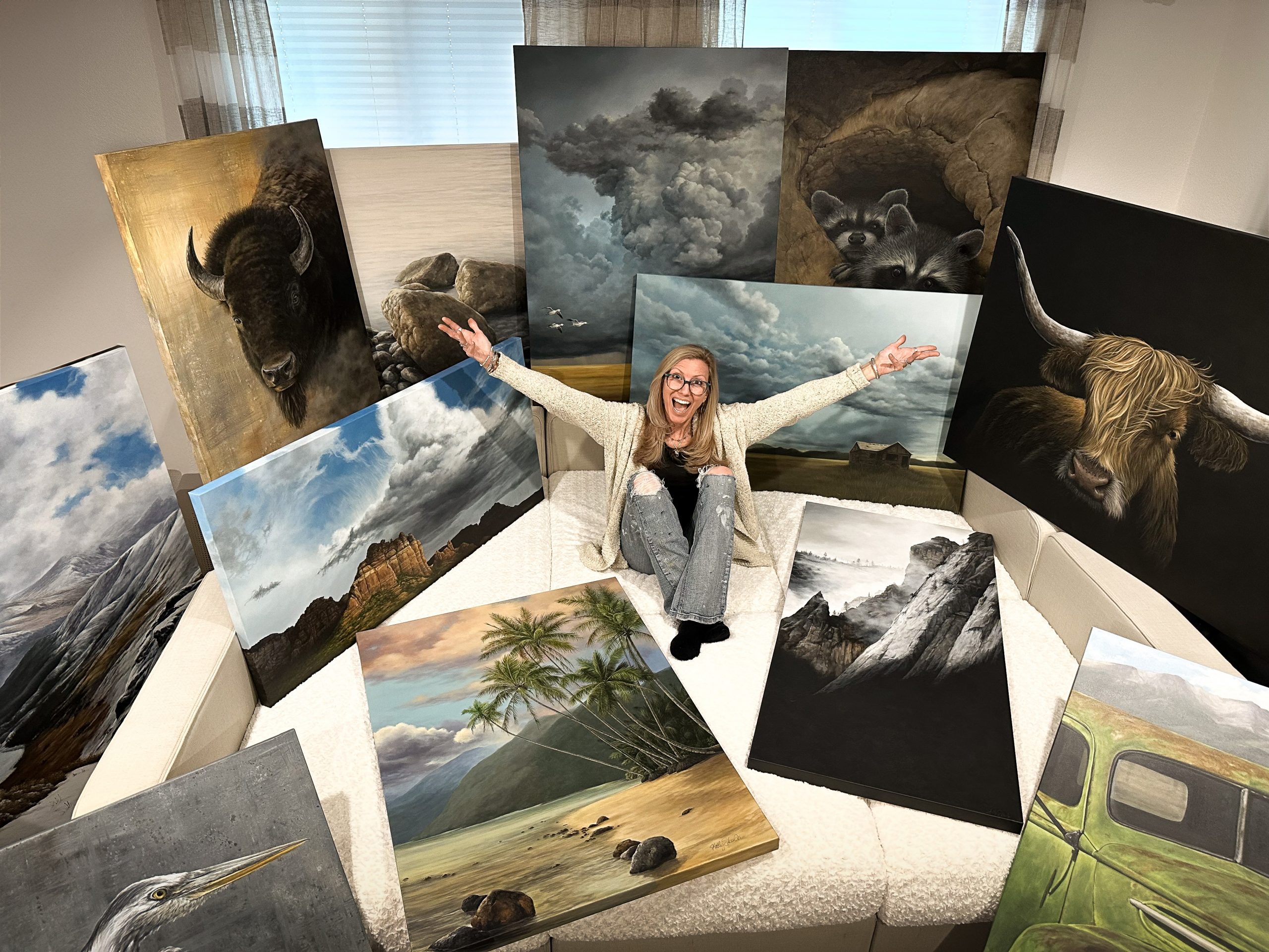 Creativity in general is a huge part of my life and career. I have always thrived in anything creative, and started my professional career in textile design in NYC, giftware design, home decorating, furniture up cycling and design and always return to what I love most and that’s painting. I specialize in acrylics and like to play around with other mixed medias. Living in Colorado, I now tend to focus my subject matter on the mountain landscapes, wildlife and every once in a while I like to do a painting of some of my favorite things. I often connect with photographers from around the country whose work really inspires a painting idea and get their permission to utilize their photo as inspiration. I like to change it a bit and often add my own sky because I have an addiction to clouds and the drama they create. This is a way for me to be inspired but also allows me to be original and creative. Often times I’ll send a print of the final painting to the original photographer who inspired me as a thank you. Given the struggles I’ve had with Lyme disease, I’m quite proud of how far I’ve come and doing better work than I ever thought I would be able to. It’s been quite a journey but I am thrilled with where I am.