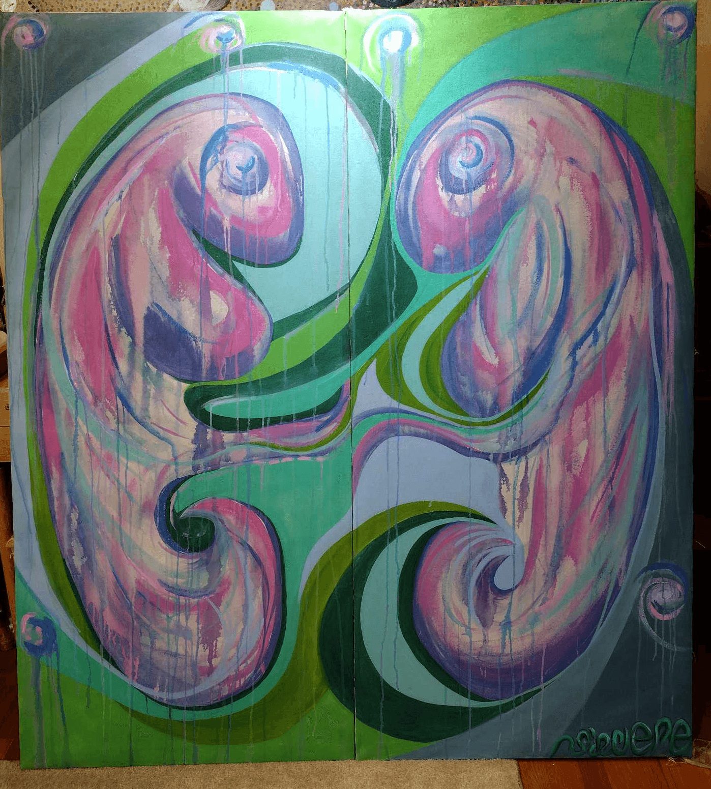 Of course, for my physical self, life has not been a smooth road. I was diagnosed with rheumatoid arthritis at a young age. It has been a major hurdle for me when trying to create pieces with pain and swelling. I think that’s why I like to work big. I like large canvases because I can use my arms instead of my crippled hands. I have endured five hand surgeries which included a three thumb/hand fusions, a ruptured tendon repair and a not so successful pinky fusion. Rheumatoid arthritis for 34 years with very little response to modern medicine.