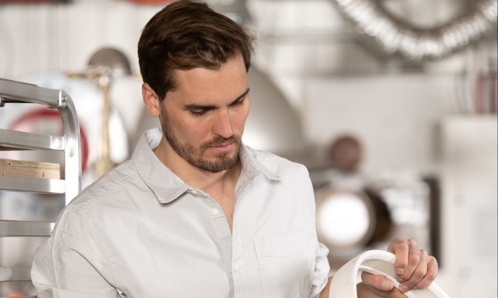 He was attempting to turn formless clay, essentially wet mud, into a geometrically perfect circle that can be married to precision metal and LED components within a few hundredths of an inch. He researched and tested dozens of techniques, had over 200 failed rings, and worked by hand through 1,300 pounds of clay over a period of more than 12 months to create the world’s first set of porcelain light rings.