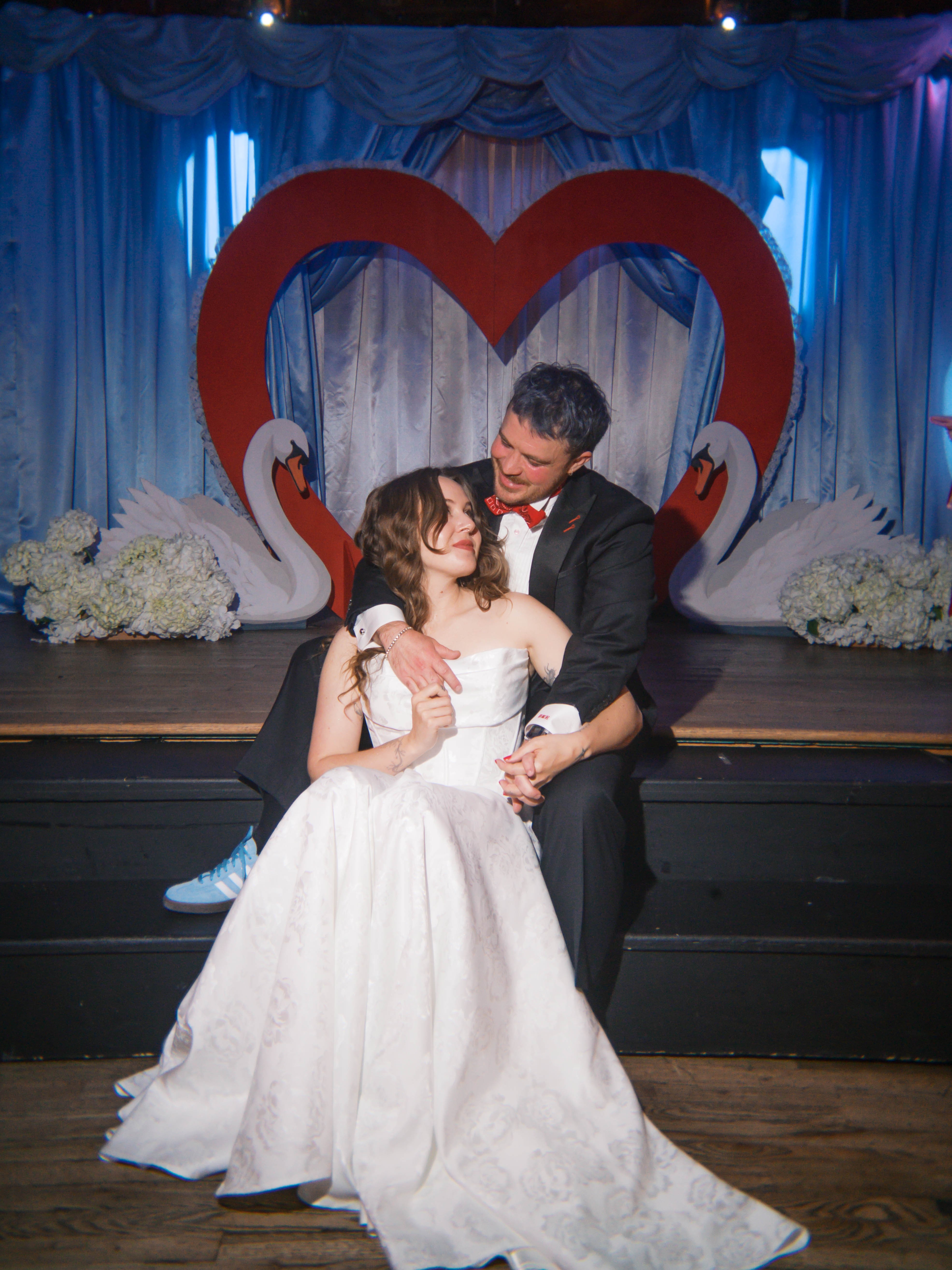 Everything about our wedding was DIY. From the giant wooden heart and hand-painted swans to the powder blue pipe and drape altar hanging behind us on stage, we did everything ourselves. We even choreographed and performed a line dance that we sent out to our guests to learn before the big night. AJ was the creative visionary behind our wedding and, with the help of myself and our industrious friends and family, she brought space to life. We also both work as stylists for Sharpe Suiting—a custom suiting company serving the Denver area—so even the wedding suit I wore was designed by us!