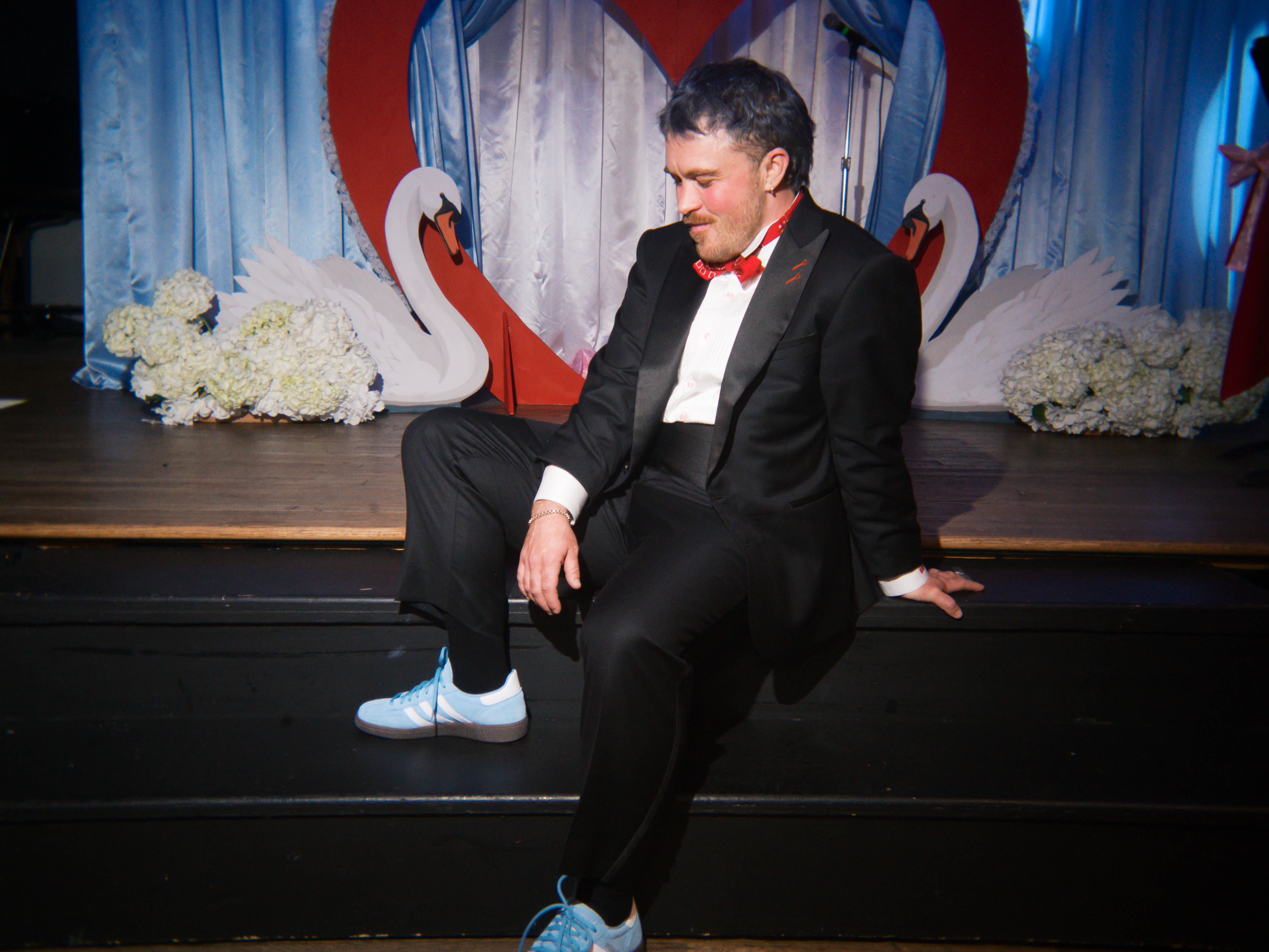 I wore an all-black custom tuxedo from Sharpe Suiting designed head-to-toe with classic elements and a romantic flare, complete with a peak lapel, racer stripe, and red, heart-shaped lapel buttonholes. As a short and stocky trans guy who has never been able to find formalwear that fits me, my Sharpe suit was a game-changer. To top it off, the white tuxedo shirt was fully customized with my initials embroidered in red on the sleeve, while the suit was constructed with a woven plaid-like fabric—a subtle nod to my Scottish ancestry.