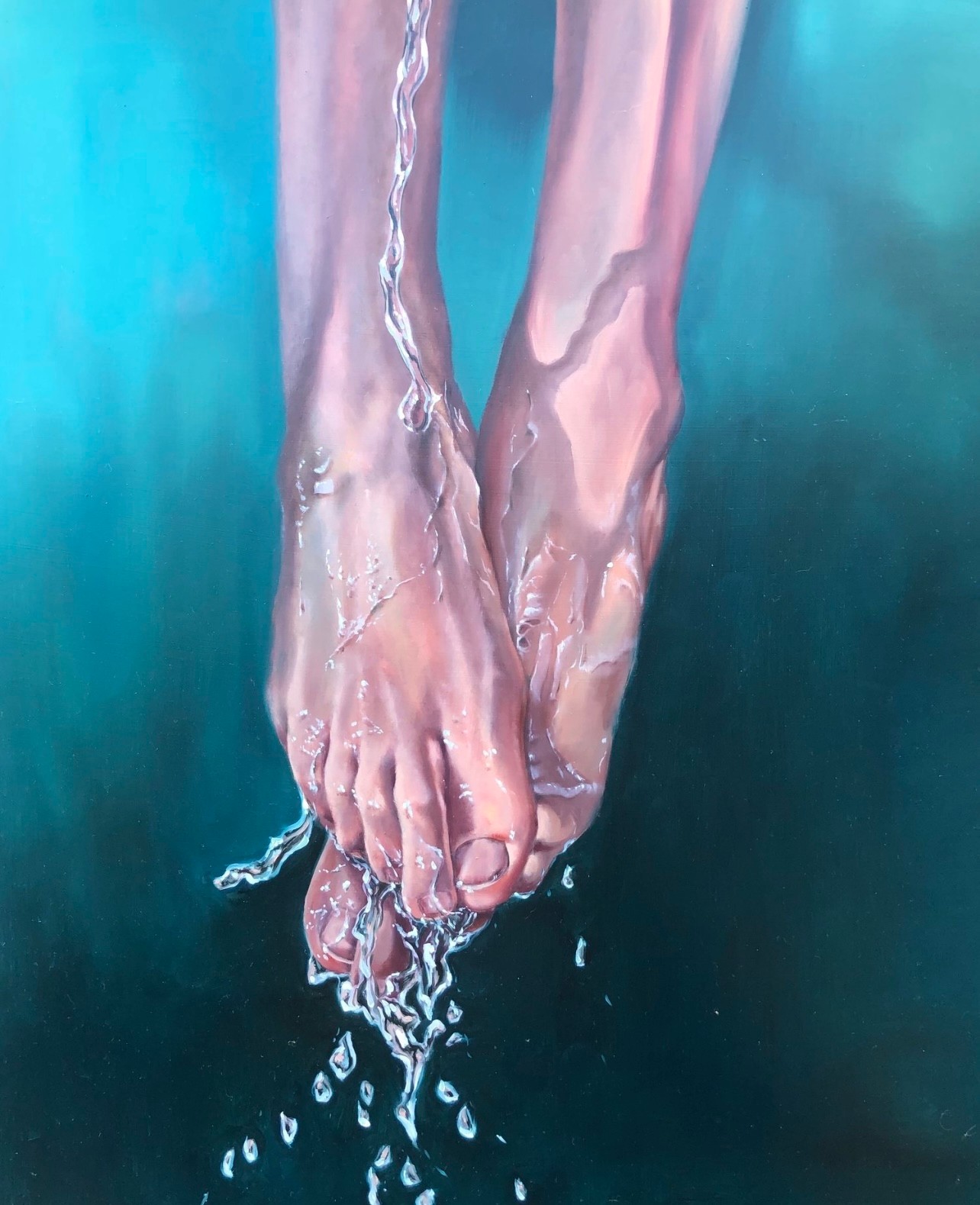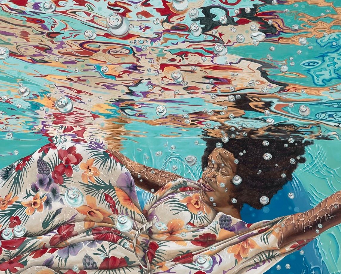 A moment to pause. I want my viewers to be present with the painting. To connect with it, and to connect with oneself. I use the abstract qualities of the environment and the detailed realism of the figure to create that reflective space. There is a focus on light and movement and how they distort and interact with the human body. I hope that the viewer experiences the idea of transparency, buoyancy, and the silence that is offered uniquely when being underwater.