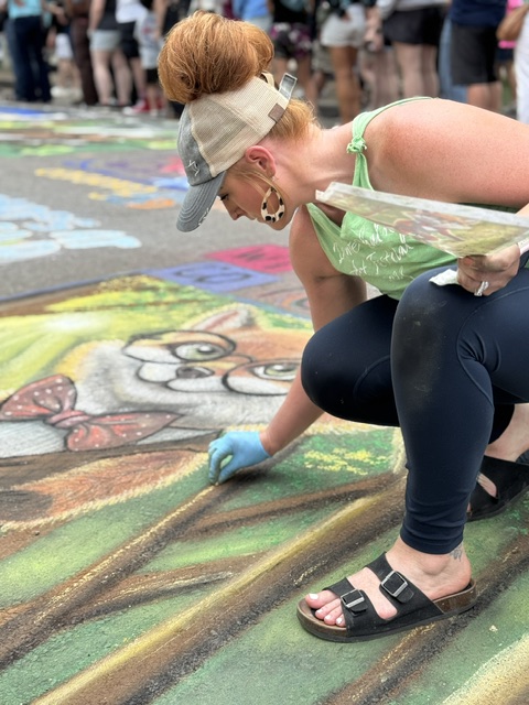 My work spans a variety of mediums, but I’m especially drawn to creating large-scale pieces that make an impact. I create vibrant chalk art murals, wall murals, and commissioned artwork in oil, acrylic, and watercolor. Each medium allows me to explore different textures, moods, and techniques — but chalk art has become what I’m most known for. There’s something magical about transforming a blank stretch of pavement into a colorful, larger-than-life piece that connects with people in real time.
