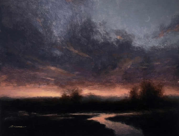 My landscape painting is a mending of both my love for art/ art history and my love of the natural world. I’ve always spent most of my time outdoors – hiking, fly fishing, foraging, understanding how light plays on everything throughout the day. I attended the Art Institute of Pittsburgh as a graphic design major, but I fell in love with art history classes while attending. I started with the Renaissance and always appreciated the landscapes in the background that are often over looked. Have you ever noticed the vast expanse of mountains in the Mona Lisa? Most people aren’t even aware of them. This lead to a love of the Impressionists, and their ability to paint outdoors (plein air) conveniently for the first time in history with the invention of the paint tube and the travel easel. I then landed on my favorite groups of artists – the Hudson River school, the American Tonalists, and the Barbizon school. Through studying these artists work, I found that they don’t only paint the exact scene as is, but rather the overall spiritual essence of the world around them, evoking deep feelings of hope or despair in a simple dusk scene. I’ve been since trying to chase the feeling of these artists through my own work. Through this journey, I’ve landed travels all over the US, and internationally. I’ve done a plein air excursion in Iceland and an artist residency in Southern Italy. I’ve had two solo shows at galleries in NYC and Massachusetts, and my landscapes have been featured in an exhibit at the WCMFA in Maryland. My work at the museum was hanging directly next to my historic idols, including Alexander Wyant, Albrecht Durer, George Inness and Frederic Church.