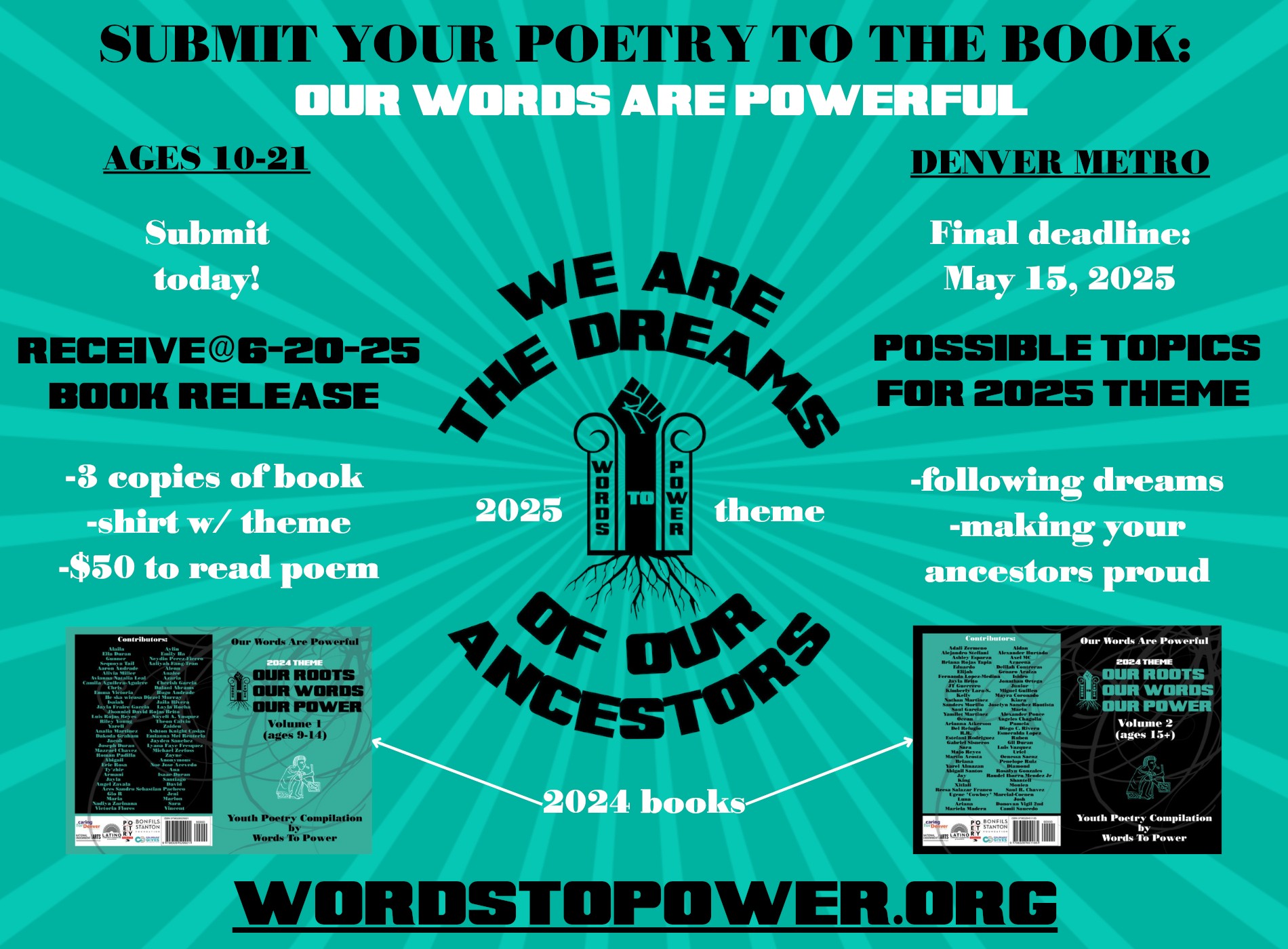 Words To Power’s mission is to show youth the power of their words. We conduct highly engaging, culturally relevant, and SEL-focused spoken word poetry workshops for underserved youth in elementary, middle, and high schools in the Denver metro area and throughout Colorado. As an extension of our workshops, we partner with schools to host presentations of youth poetry. Words To Power publishes an annual book of youth poetry with submissions from our workshop participants. We then host a community showcase with contributors, offering them an authentic opportunity for academic excellence, creative expression, and community engagement.