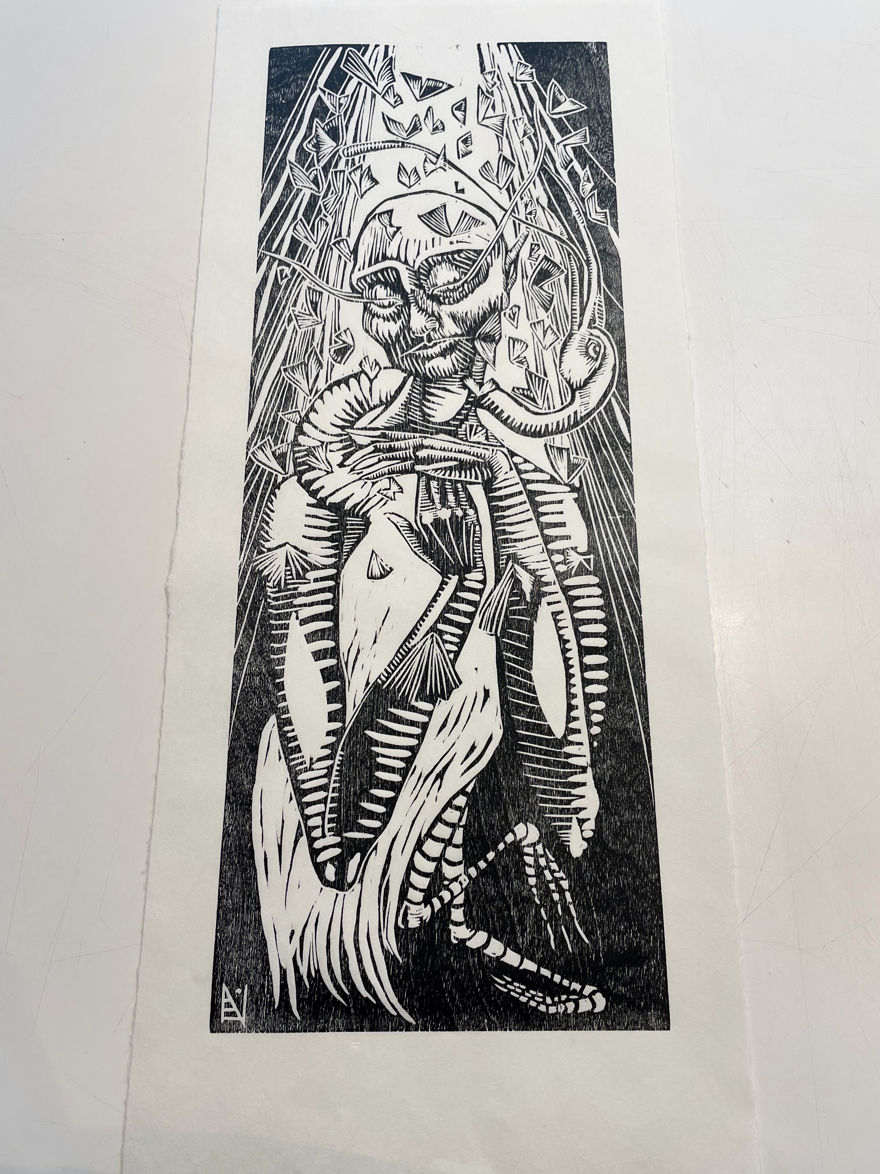 I’m most proud of pushing myself hard. I have two other jobs and I print and carve in my off time, also making time to sew and sculpt. I’m proud of making work that humanizes the monstrous, work that disturbs.