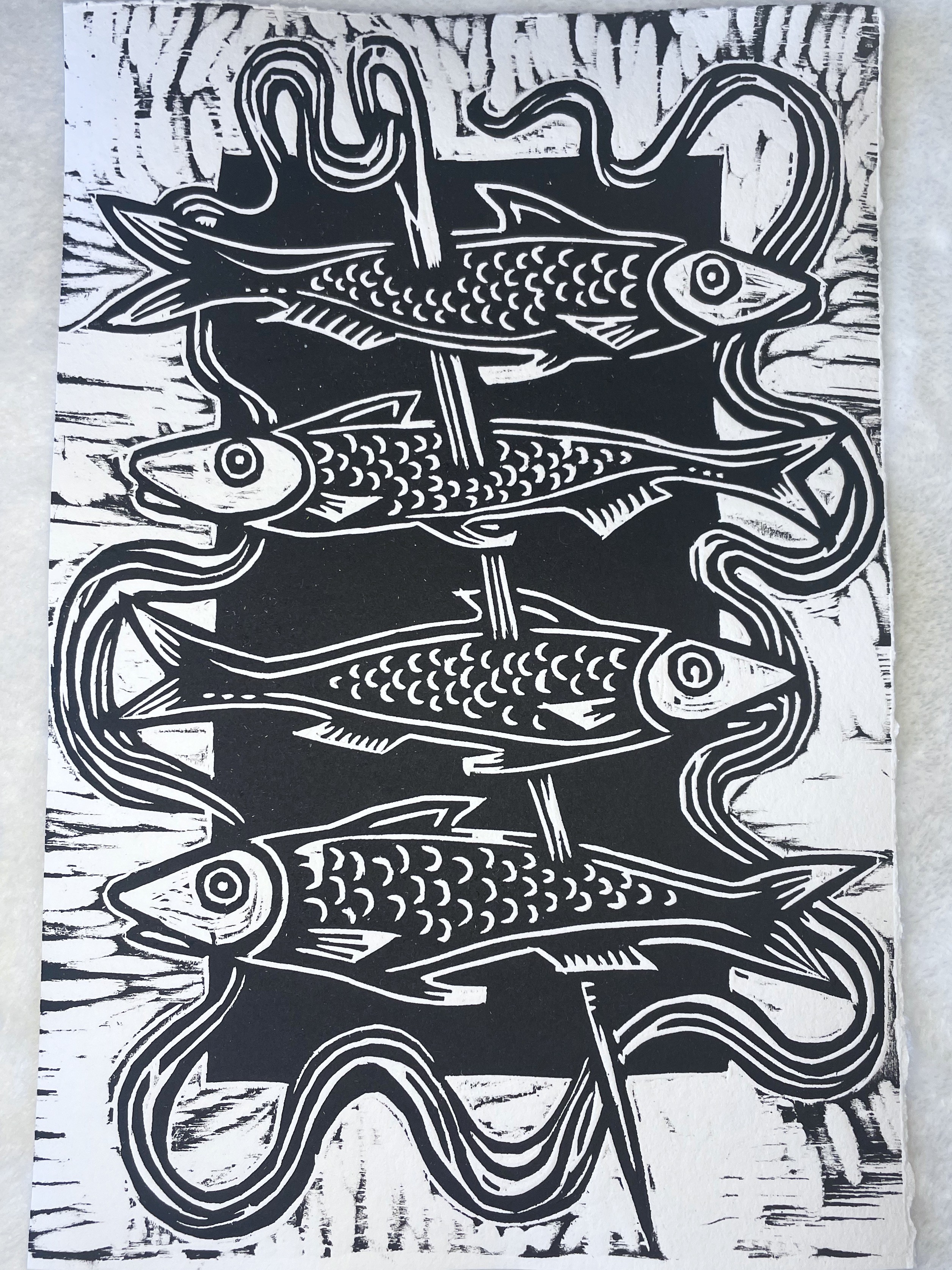 I make relief prints, typically wood block prints. I carve out the negative space using chisels, leaving behind the positive space to be inked and printed onto paper.