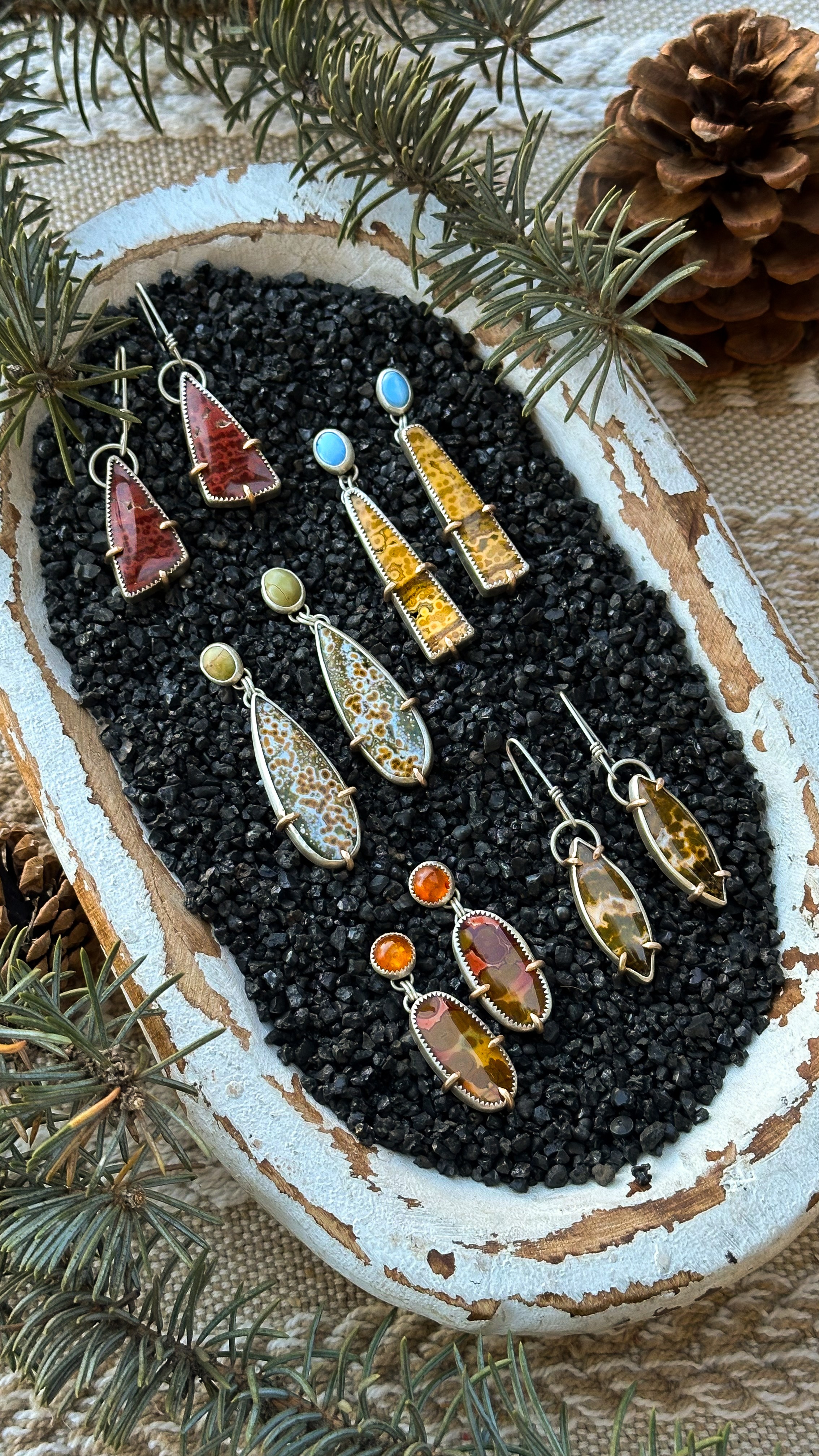 I create handmade, ethical, nature-inspired, .925 Sterling Silver jewelry featuring precious stones such as turquoise, fire opals, jaspers, and moonstones.