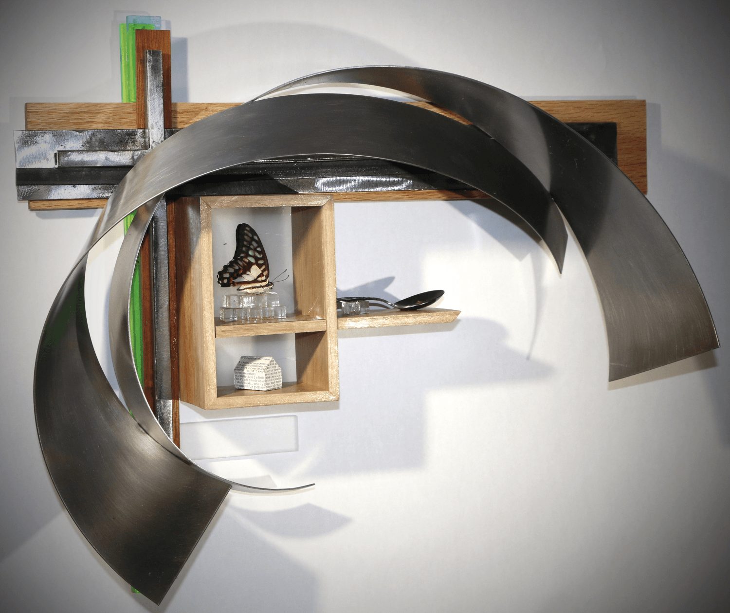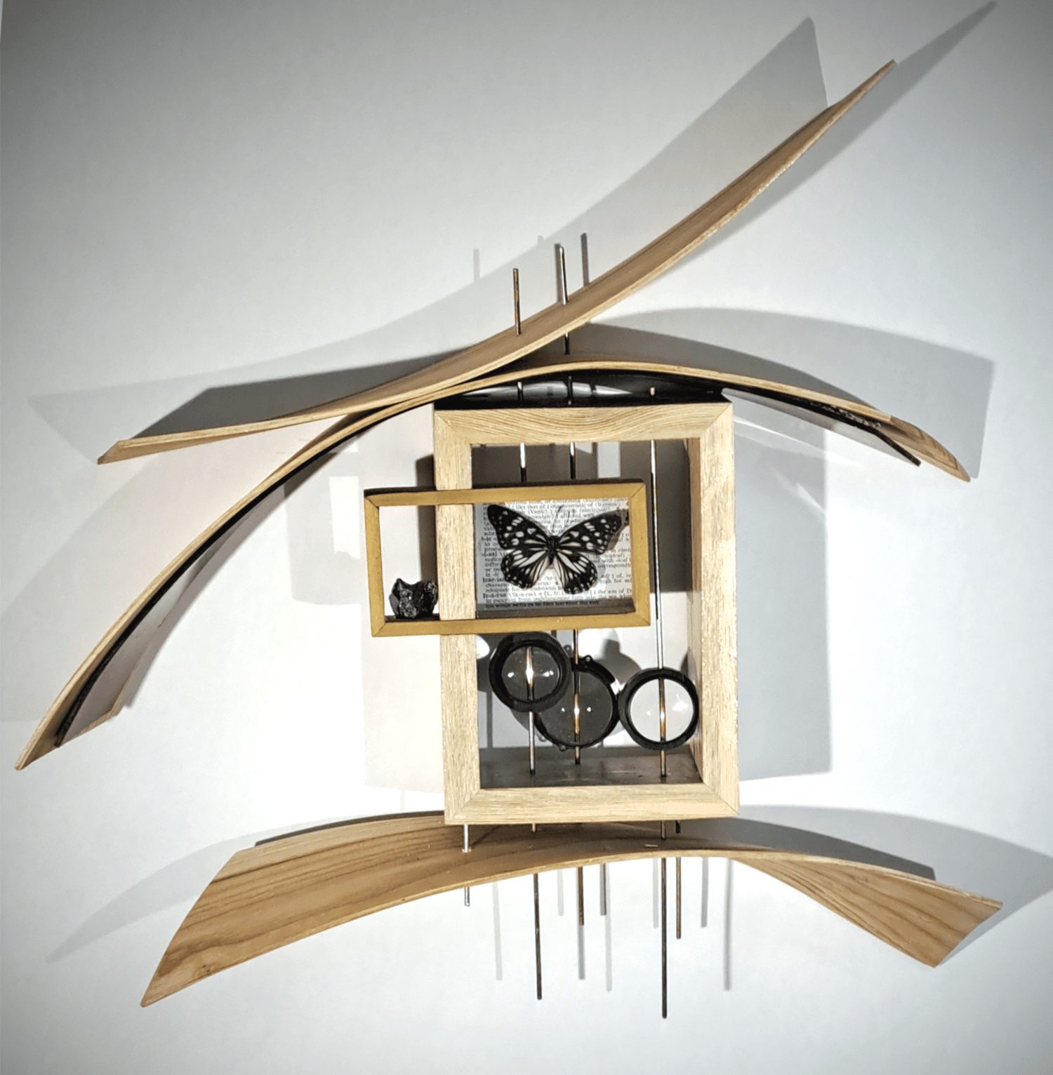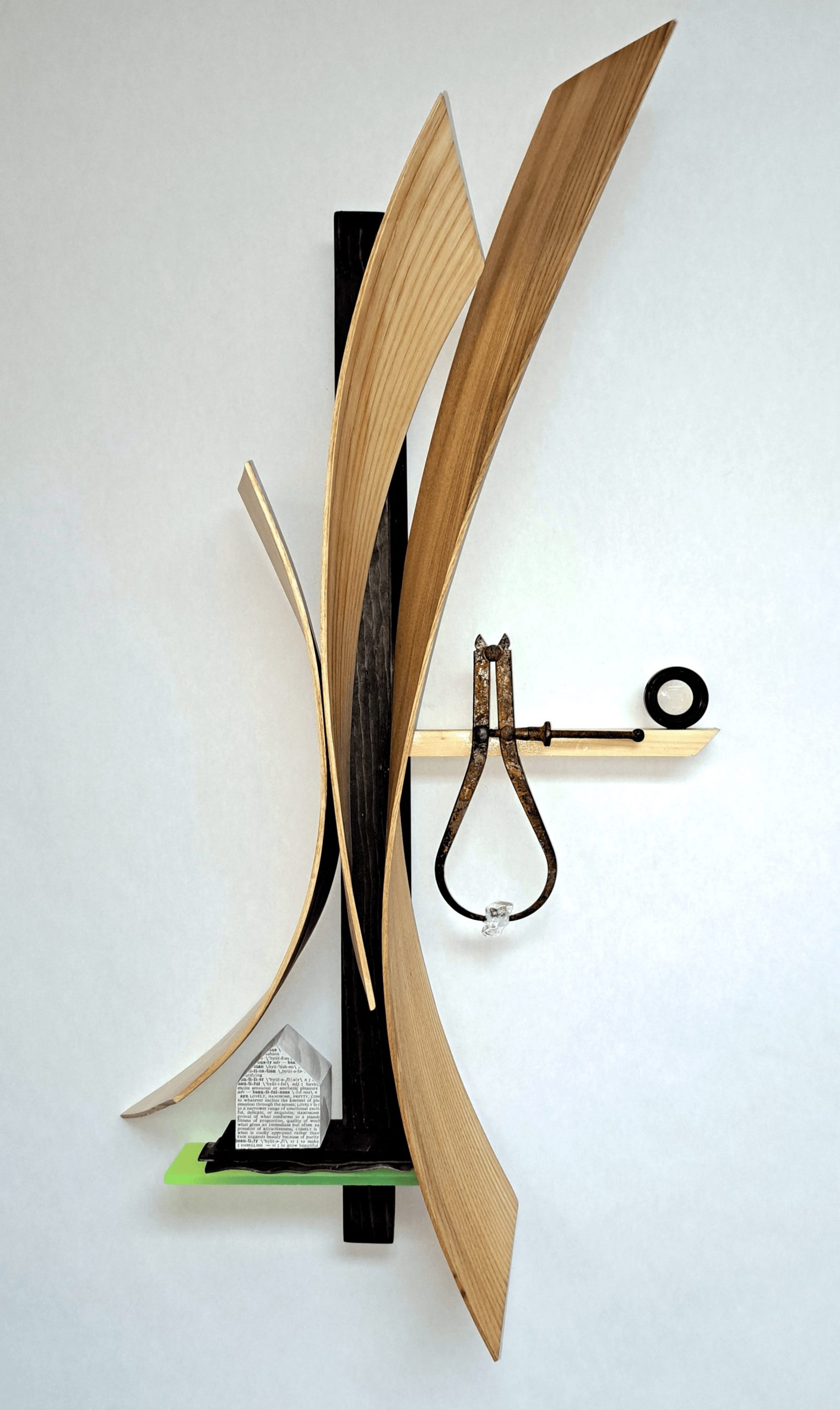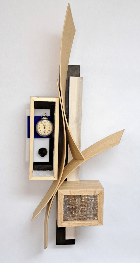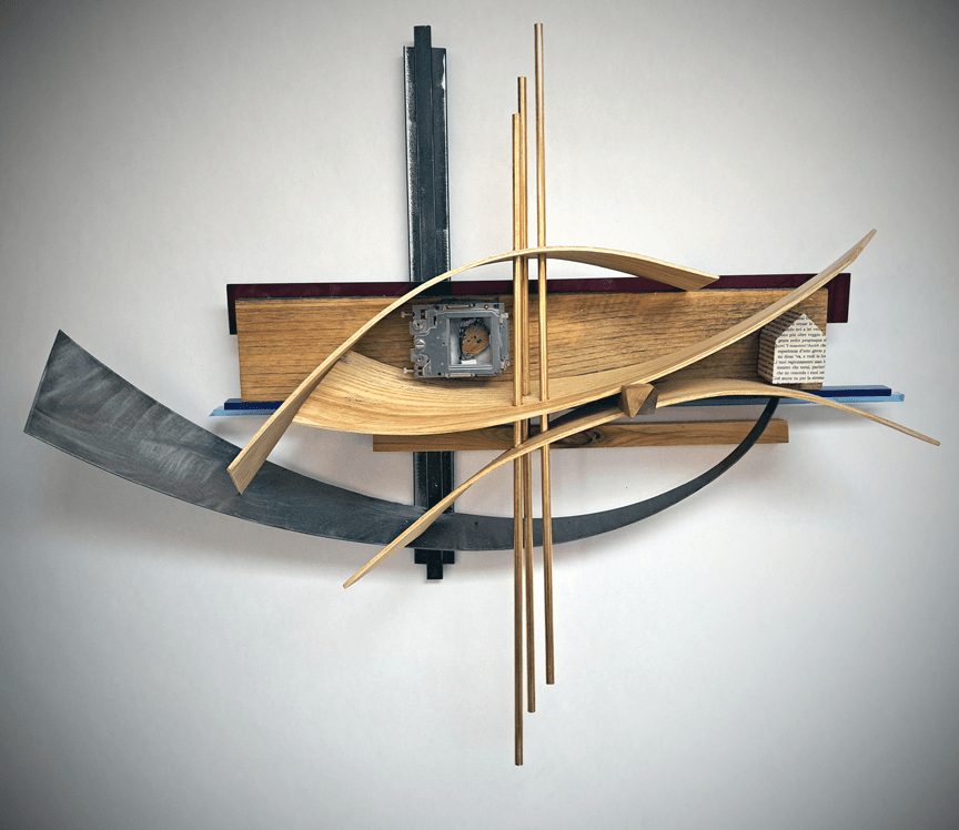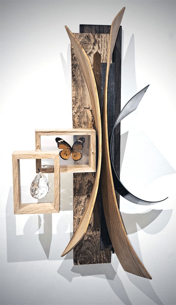 I create works of art using a wide variety of materials. Initially, I worked with primarily wood, steel and found objects. As I developed my processes over the years, I felt the need to enhance the work with a splash of color so I started incorporating acrylics into the sculptures. Most recently, I built myself a steamer so that I could add curved lengths of wood. I often tell people that I get bored easily so I’m always experimenting and playing with new materials and media. A few years ago, I started playing with video but not in a normal way. Shooting it through optic fibers or up a column of rice paper. I also started playing with led lights just to see what I could do with them and they would alter my ideas.