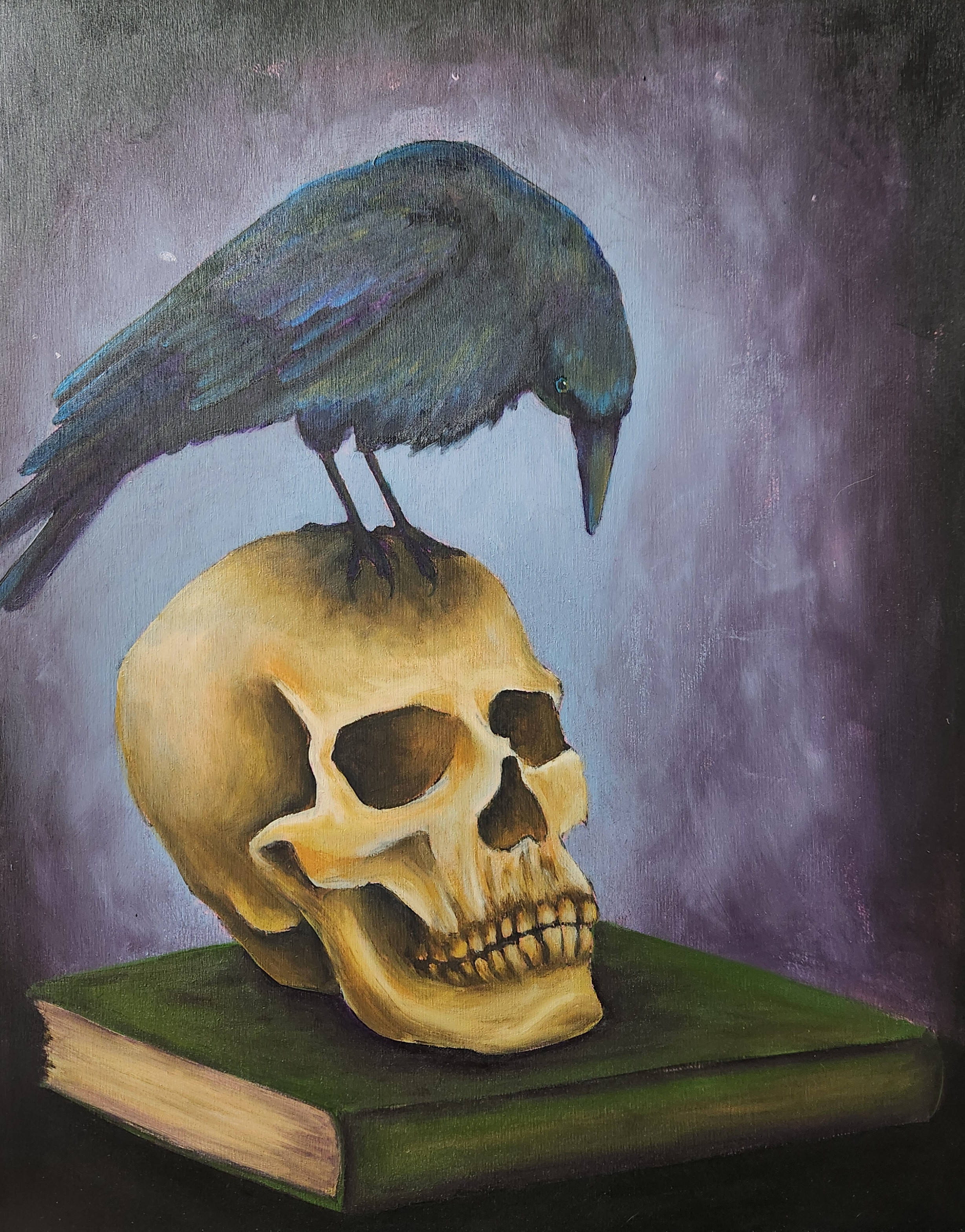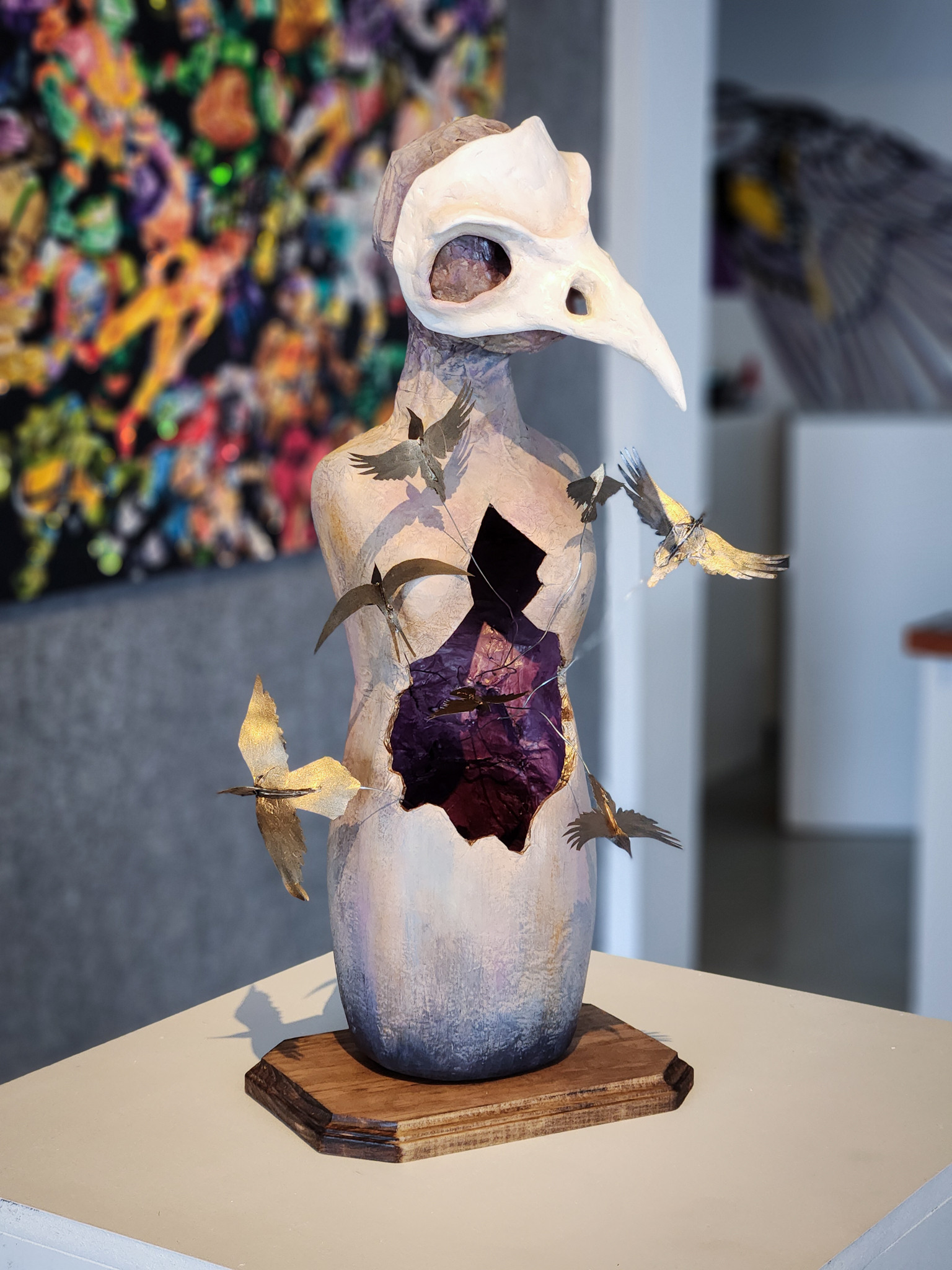 My name is Desirée and I’m a visual artist based in Cheyenne, WY. I own Magpie Creations, under which I make paintings, illustrations and mixed media work, as well as a variety of printmaking pieces. I love playing with materials, learning new techniques, and then applying those to methods I’ve used for years, so my studio is full of art supplies. Most of my paintings are of birds, but sometimes I add in another subject or two. I like to think about how we engage with the world, how we impact it, and how it impacts us, and I use a lot of symbolism in my work to reflect this. My illustrations range from flora and fauna to commentary on humanity, continuing on that theme of reflection. My mixed media work is often sculptural, and ranges from serious and introspective, to just fun and weird. Finally, my prints are the most ever-changing, and I’m actually in the process of rethinking how I want those to look and feel, and how they fit with the rest of my work. I love lino block printing, and focus on the bold shapes and textures that come with that process. But I also love drypoint and collagraph, and the textural details that come with that.