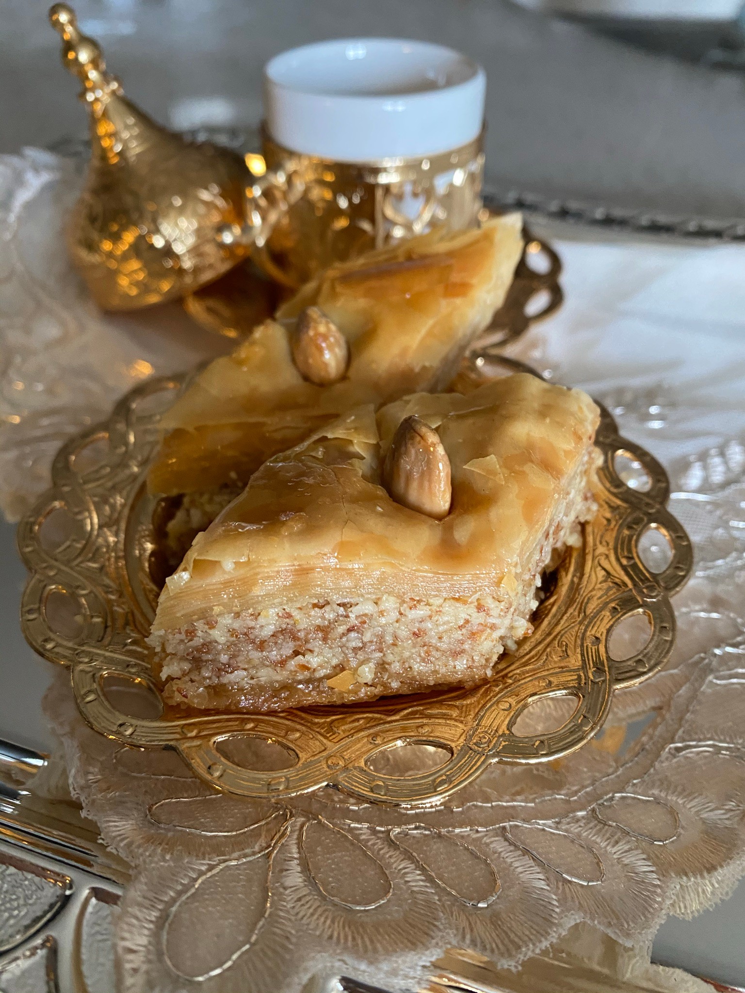 We’re huge on honey in Libya and almonds are abundant in North Africa. That’s why the traditional Libyan recipe only uses high-quality honey (not mixed with any sugar syrups) and almonds for the filling. The combination of flavors and the quality of ingredients we use in Libya makes for a very rich, decadent experience that sets it apart from other recipes.