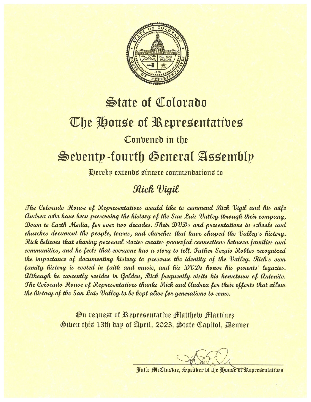 Hello, I’m Rick Vigil, a Colorado native who is currently residing in Golden, Colorado. I am the co-owner and film producer of Down To Earth Media, LLC. My goal over the past twenty years has been to produce a collection of film documentaries entitled “A Story To Tell” which document the language, culture, spirituality, and traditions of the Spanish-speaking communities living within the counties of Conejos and Costilla over a long period of time in the San Luis Valley.
